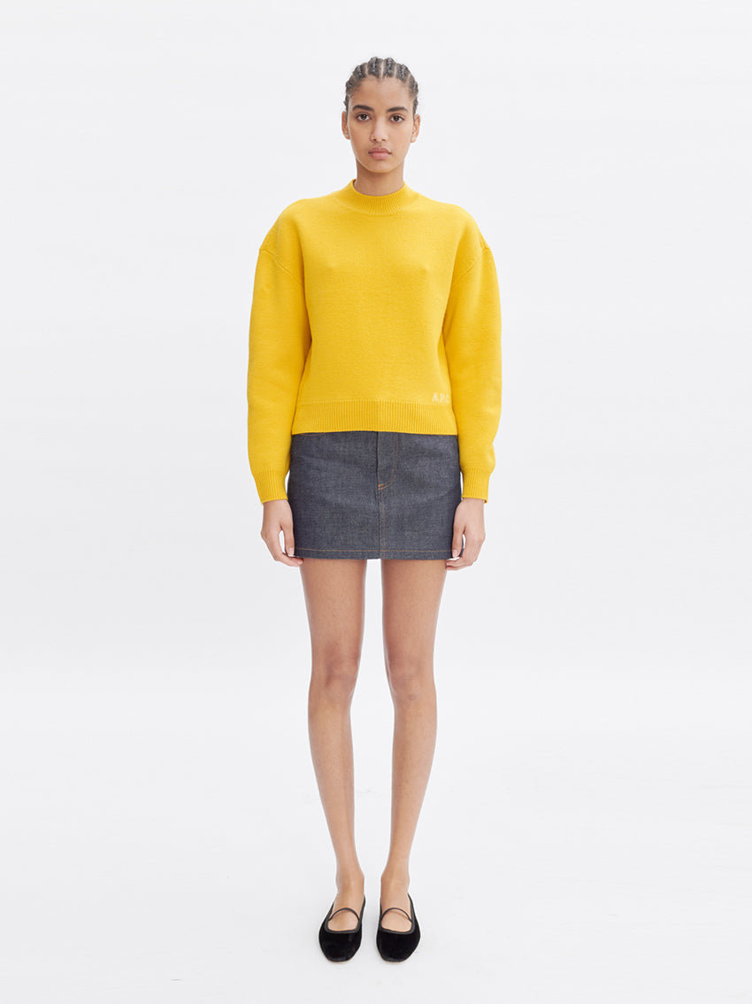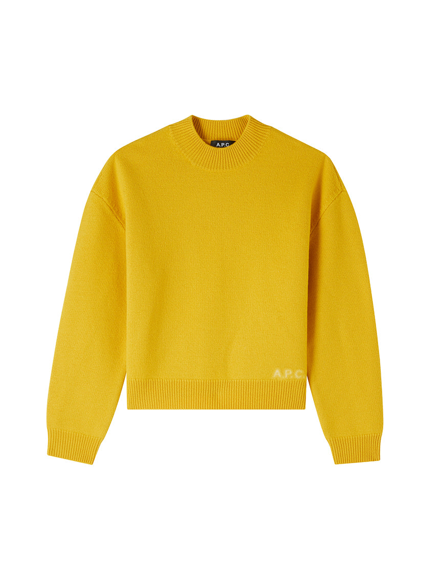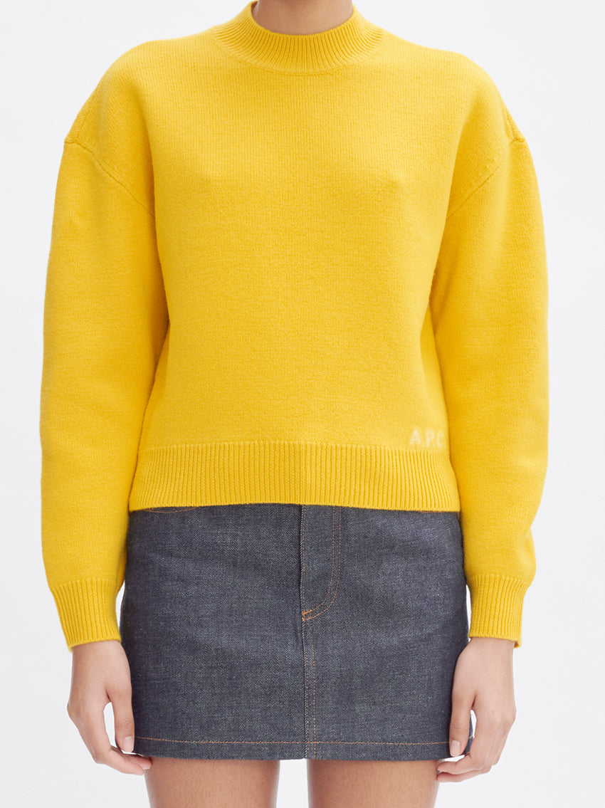 A.P.C. Esther Jumper Yellow in thick Merino wool. Soft, warm and thick material. Boxy cut. Crew neck. Sloping shoulders. Contrasting A.P.C. logo at lower left. Six tone-on-tone corozo buttons. 100% wool. Made in China. Machine wash, delicate cycle, or by hand.