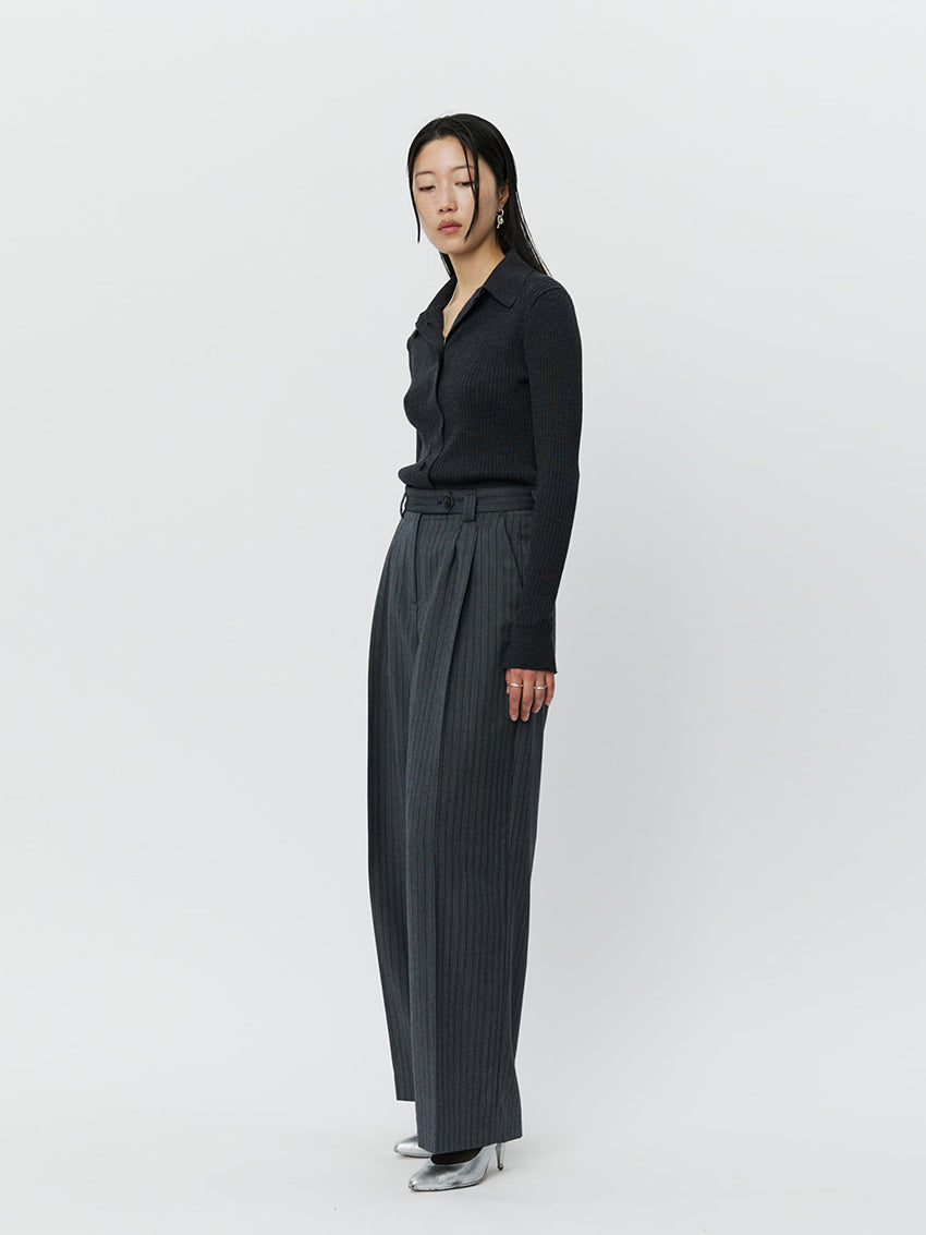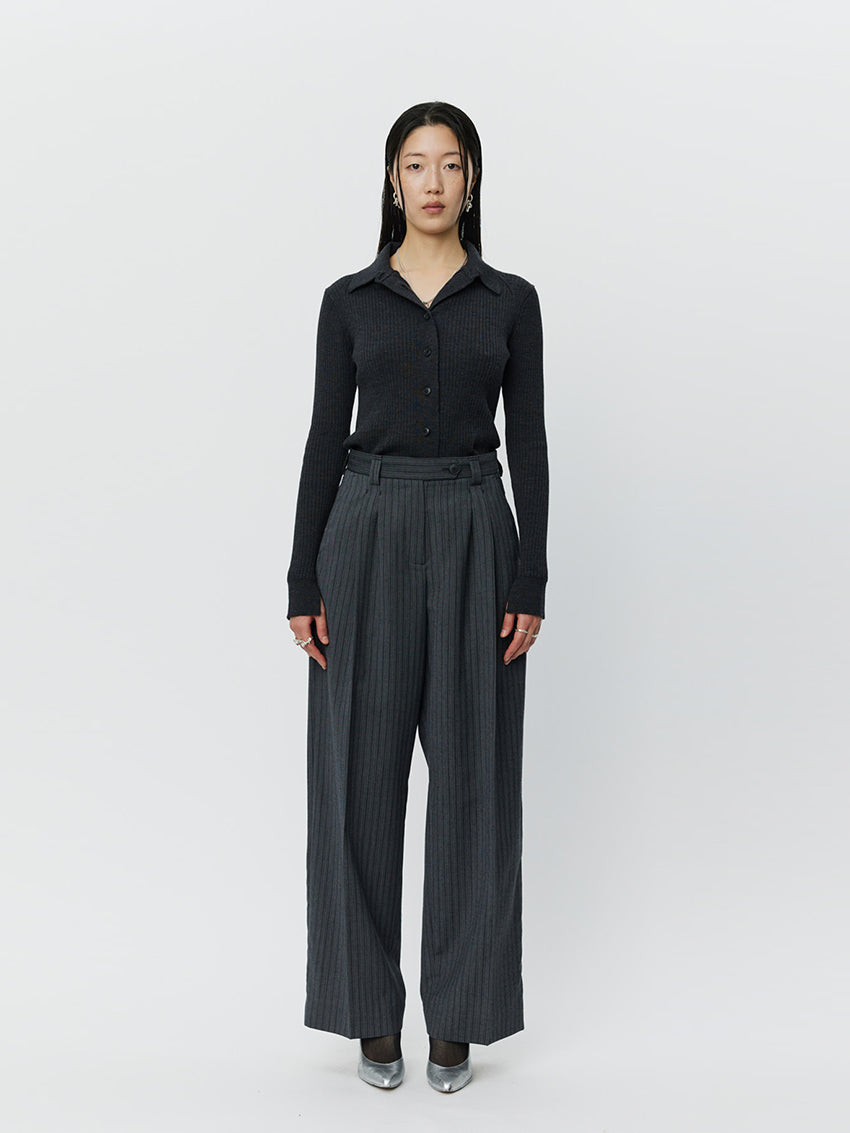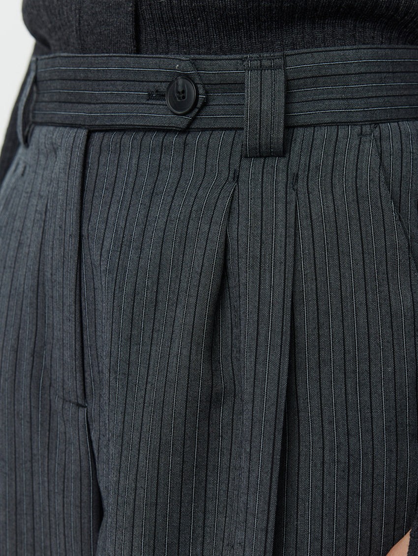 The Favorite Trousers have a wide straight fit with double pleats and a mid-rise. Featuring side pockets, rear welt pockets, button closure, hook-and-eye closure and YKK zip fly. Cut from a soft Italian deadstock wool with a slight sheen, in a subtle double pinstripe on a grey ground.