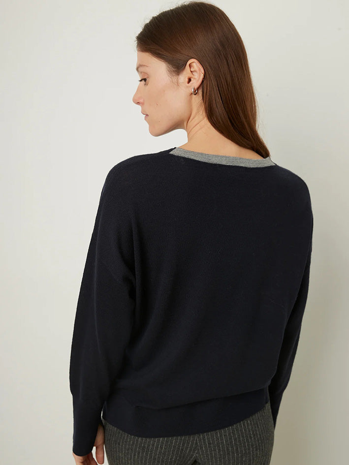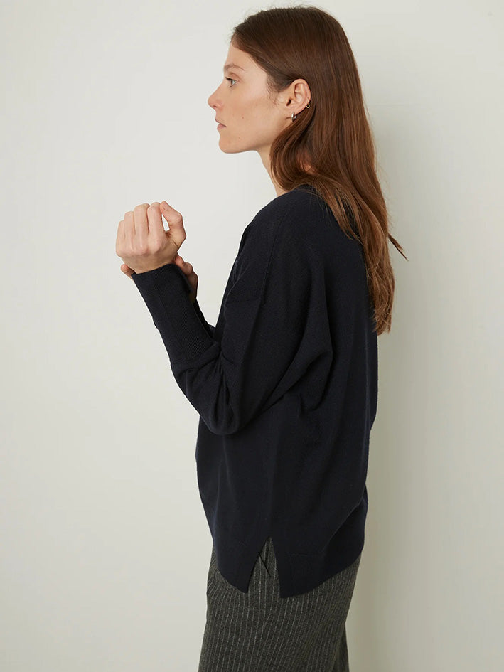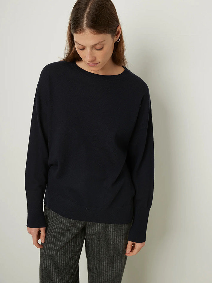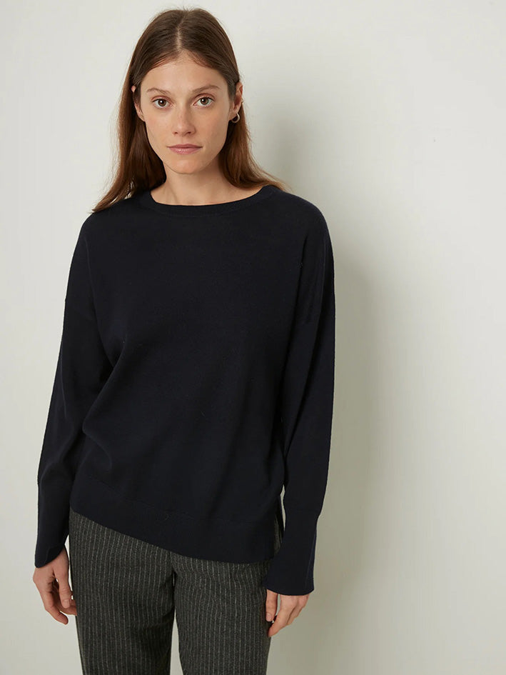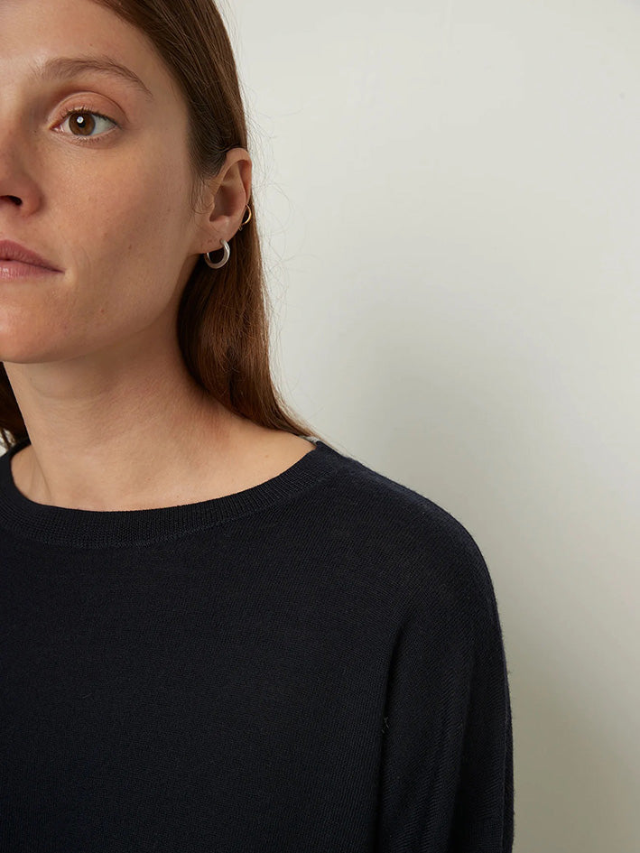 Rue Blanche oversized Fine Sweater in Midnight is knitted (fine plain jersey technique) in an extra fine merino wool for a fluid drape in deep navy. It is designed for an oversized fit and features a wide round neckline, dropped shoulders, and side slits. Its details include a knitted colour variation in the back neck, and a ribbed neck, cuffs and waistband.