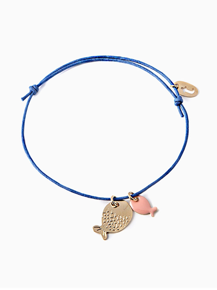 The fish mummy and her little baby on a cotton string to wear on your wrist. Pendants in gilt brass (24K gold) and colored resin on cotton thread.