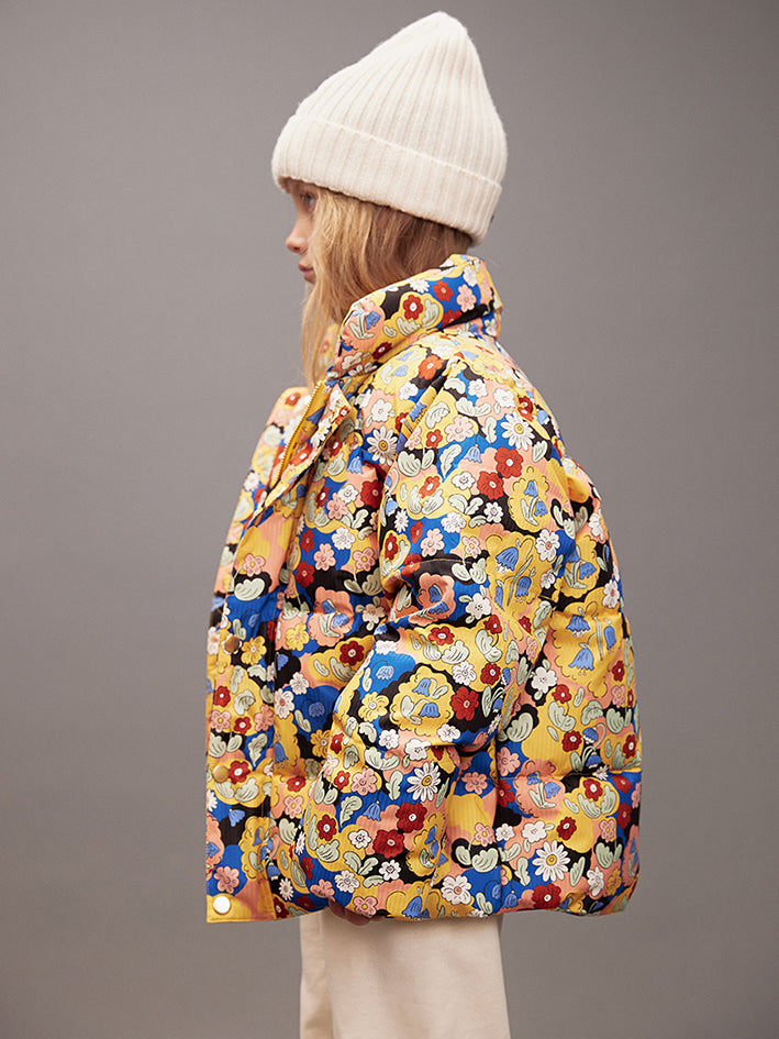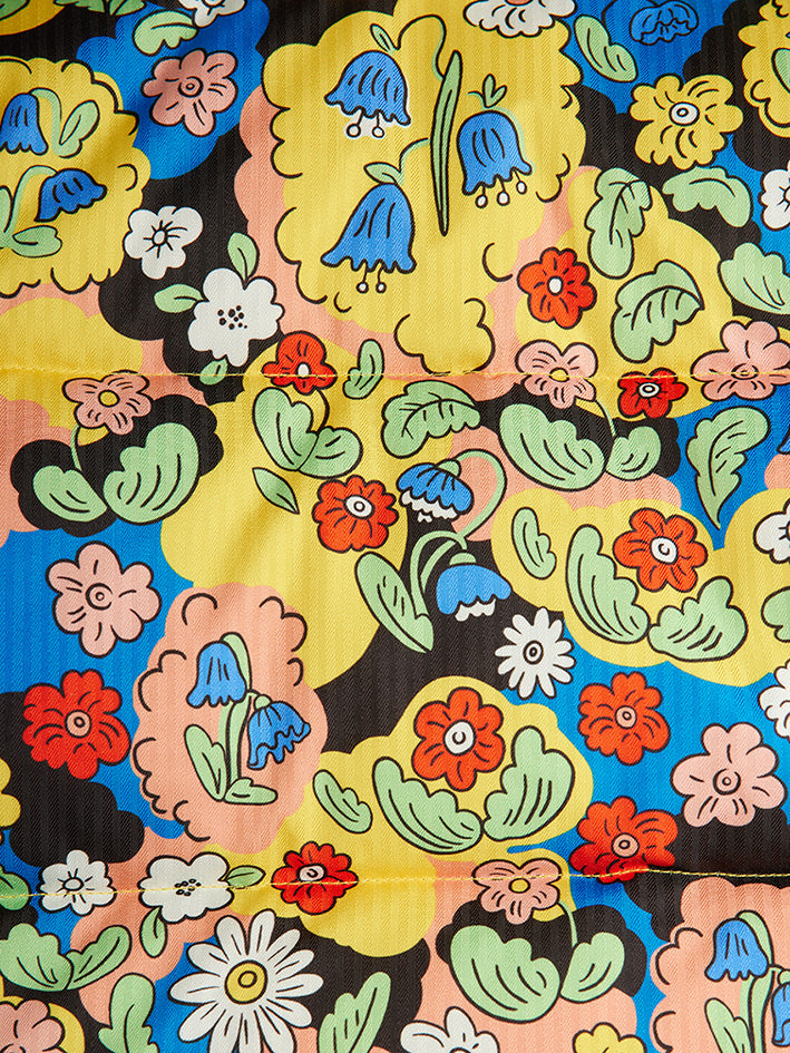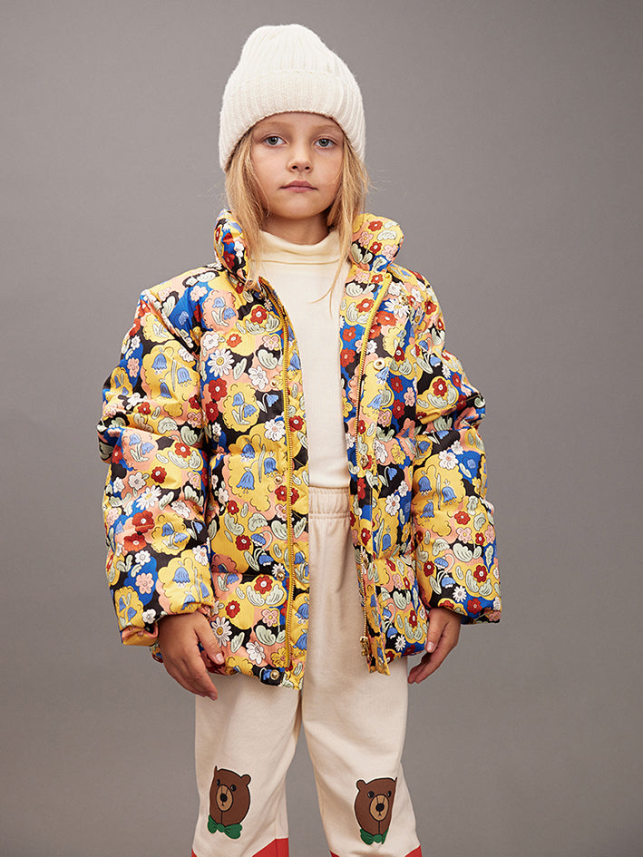 Water repellent and windproof Mini Rodini Citypuffer Jacket Multicolor with an all over Flowers Allover made from 100 % recycled polyester.