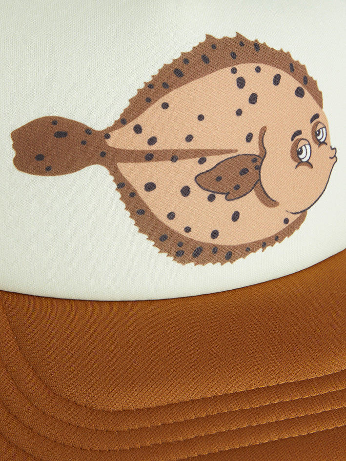 Mini Rodini Trucker Cap Brown with Flundra print on the front made from 100 % recycled polyester.