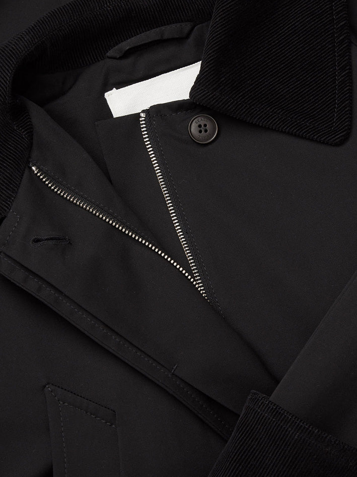 The Gaby Jacket in Black from Skall Studio is made in a water repellant organic cotton. The jacket has an oversize fit with an adjustable elastic drawstring in the waist and is inspired by the English country style. It is designed with a round neck opening and a hidden placket with push buttons and closes with a zipper. It has four pockets on the front, one pocket inside and a quilted lining. The wide raglan sleeves has corduroy details on the inside of the cuffs. The same corduroy details adorn the collar and the inside of the pockets. SIZE RECOMMENDATION Relaxed fit offering freedom to move effortlessly. Designed in a loose silhouette falling freely on the body. If you prefer it less loose, we recommend sizing down. The model is 177 cm tall and is wearing a size 36. FABRIC AND CARE • Outer and lining: 100% organic cotton • Padding: 100% polyester • Dry clean only • Produced in Bulgaria