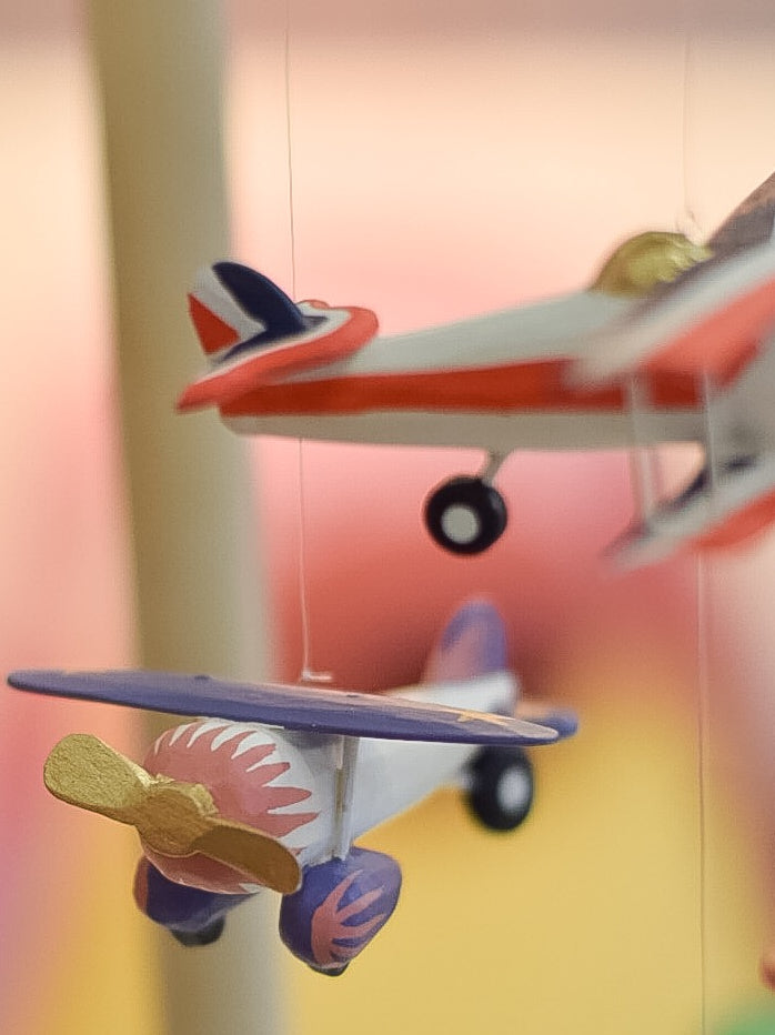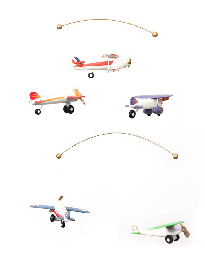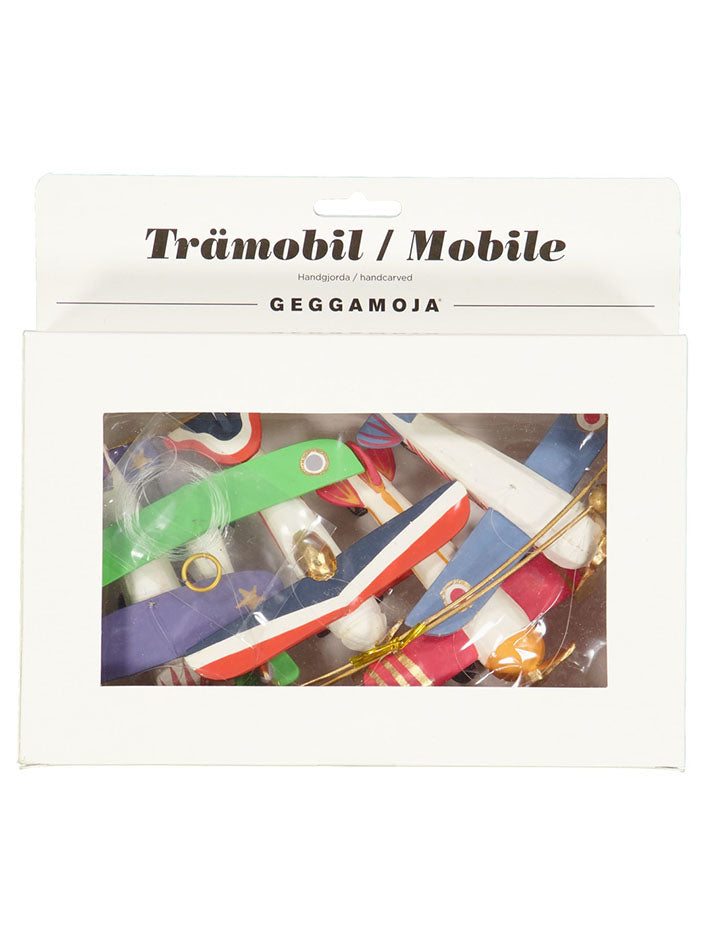Hand-made Mobiles by Geggamoja from the Philippines. Made of local wood and water-based colors. This is not a toy. The wooden Airplanes are for design purposes only; as soon as the child can reach the mobile; it should be removed within the child's reach. They slowly spin around; make a nice eye catch and enhance the feel of any room in which they hang. Mobiles are not just for decorating baby rooms; but a good decoration for all ages and rooms. There is one for every taste - handmade and unique. Easy to hang up in a small metal ring. The thread can be adjusted as desired.