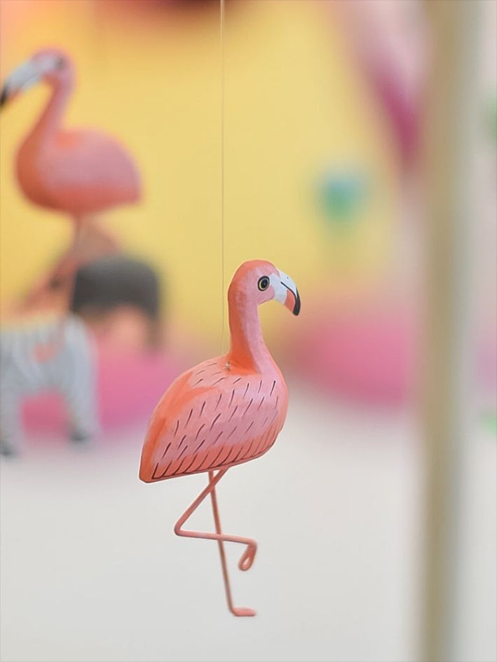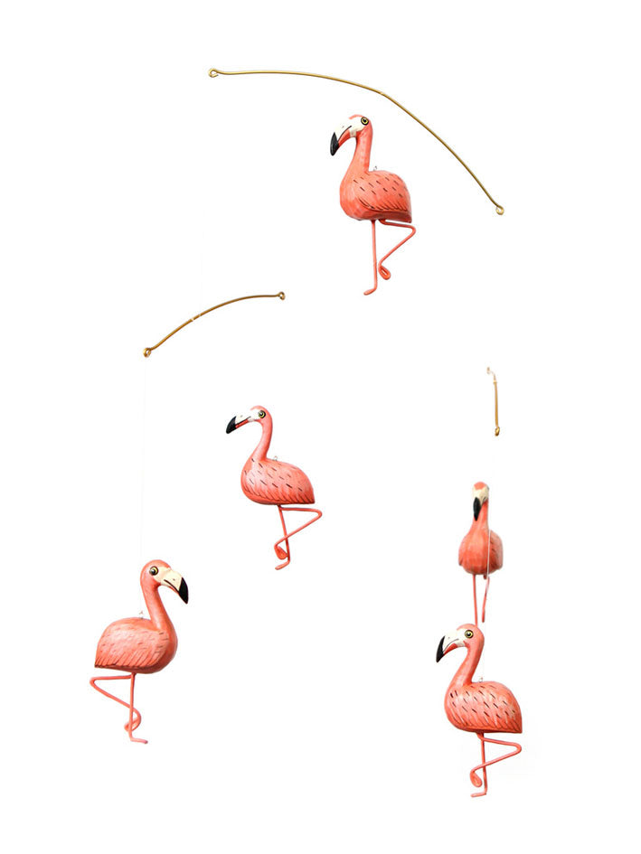 Hand-made Mobiles by Geggamoja from the Philippines. Made of local wood and water-based colors. This is not a toy. The wooden Flamingos are for design purposes only; as soon as the child can reach the mobile; it should be removed within the child's reach. They slowly spin around; make a nice eye catch and enhance the feel of any room in which they hang.Mobiles are not just for decorating baby rooms; but a good decoration for all ages and rooms. There is one for every taste - handmade and unique. Easy to hang up in a small metal ring. The thread can be adjusted as desired.