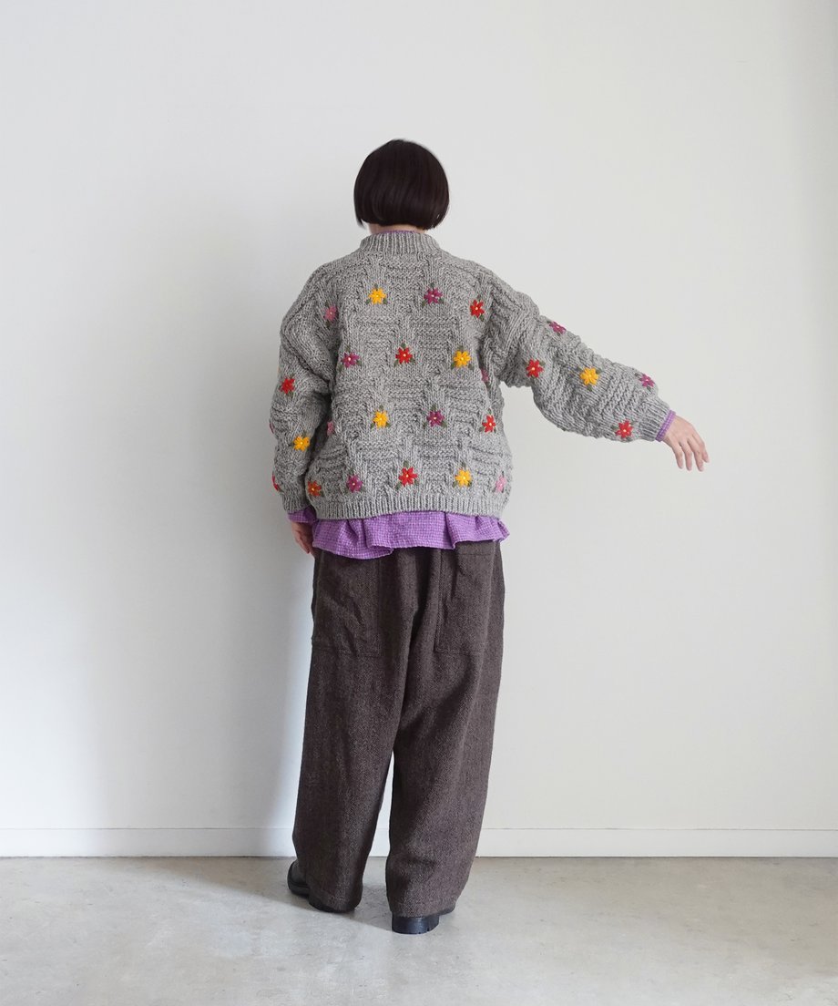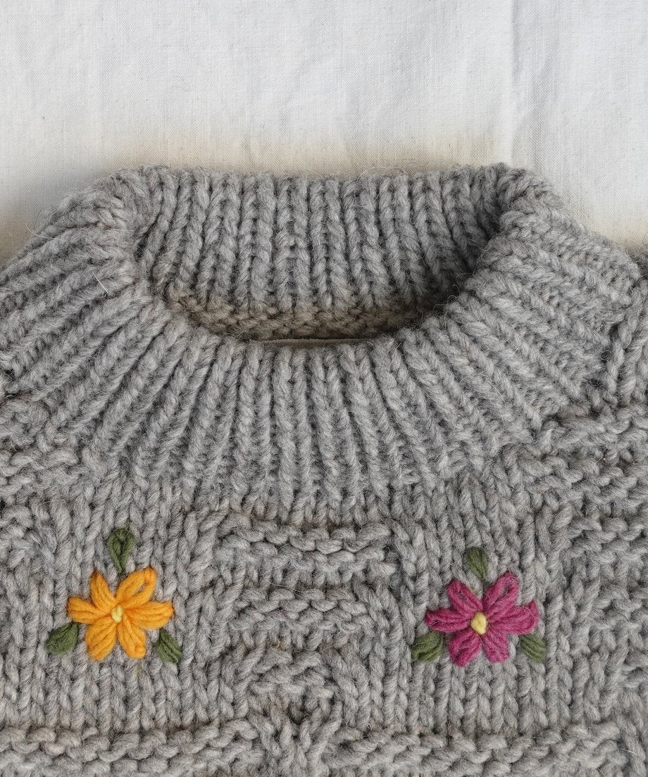 A warm knitted pullover with colorful small flower embroidery carefully woven on a rough knitted fabric.