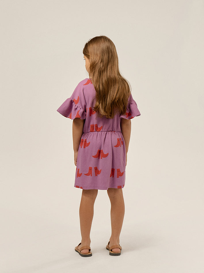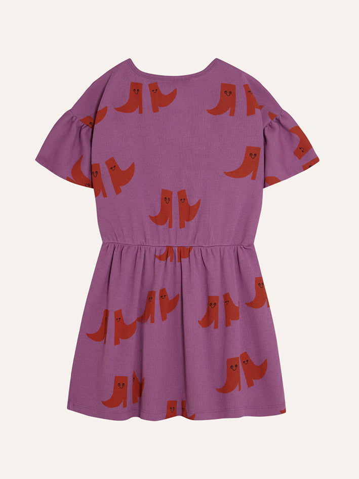 Purple rib Dress from The Campamento with elasticated waistband and elastic in collar for more comfort. A beautiful print of Happy red Boots decorate the garment. Loose fitting and short sleeves. Medium length. Rib 100% cotton. Made in Portugal.