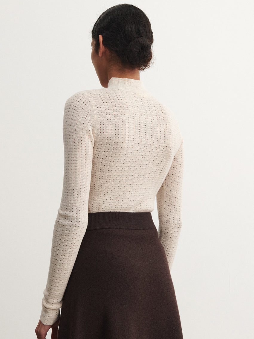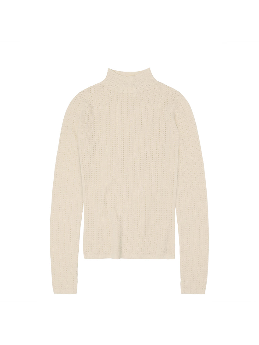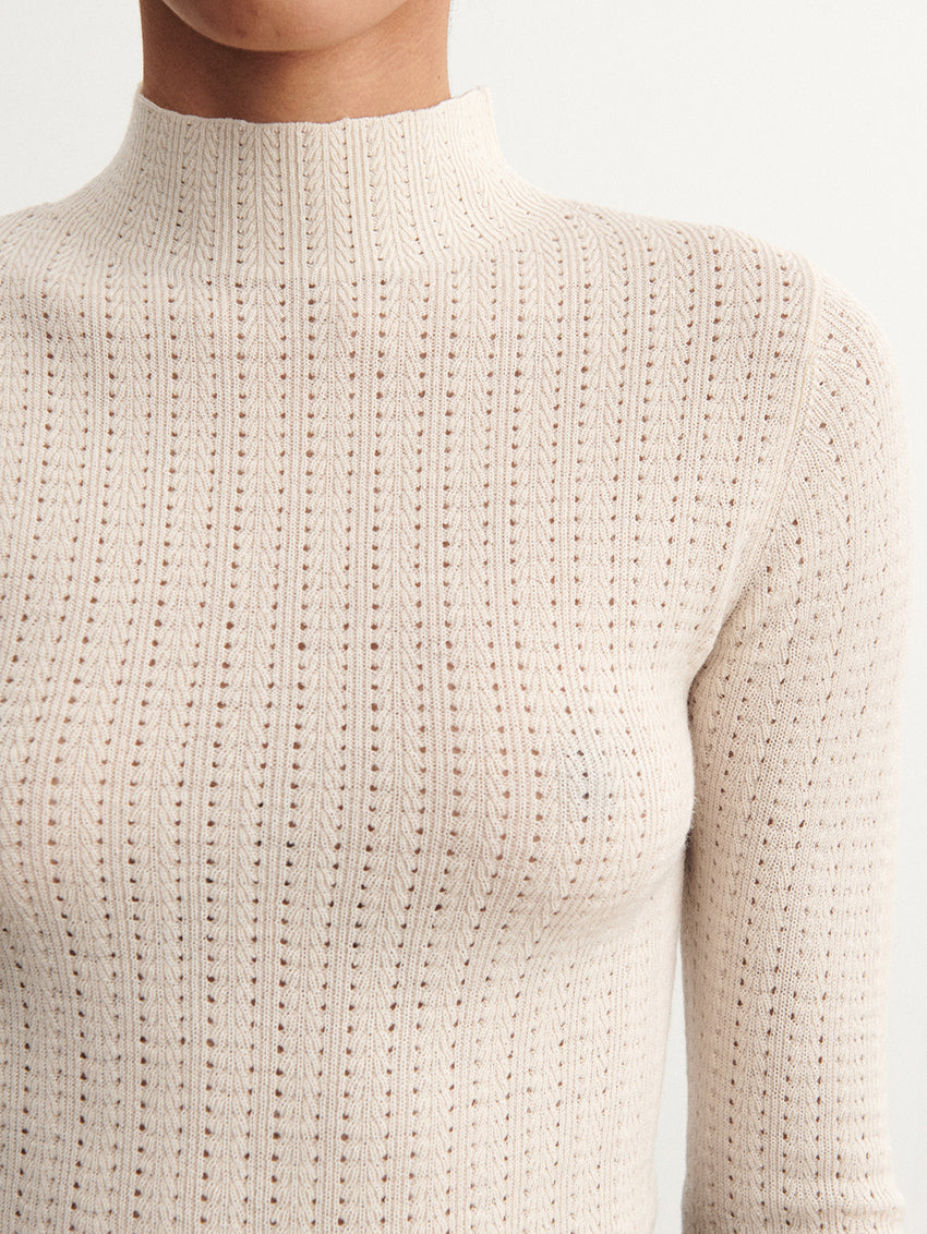 The body and sleeves are knitted in a decorative pointelle rib structure with clean self-edges.
