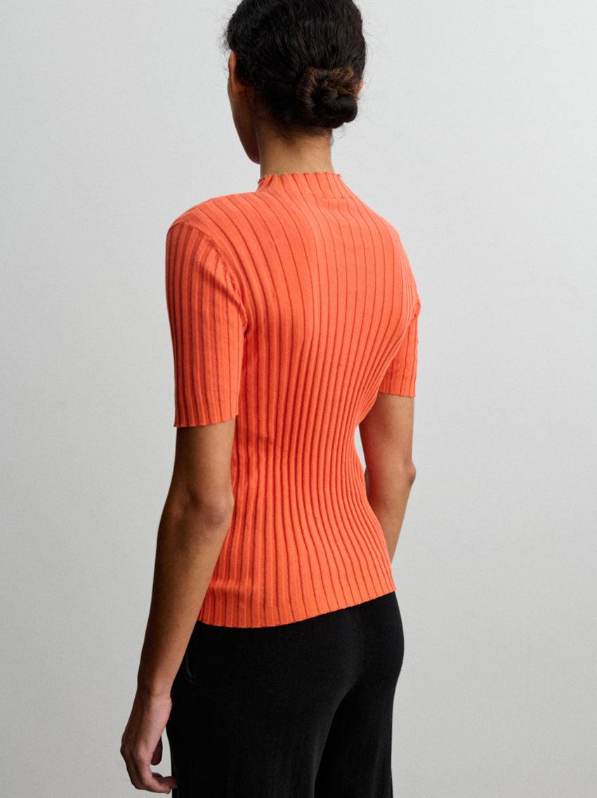 Knitted in a fine Rib, this short-sleeved Top in Tangerine by Fub has a straight slim fit.