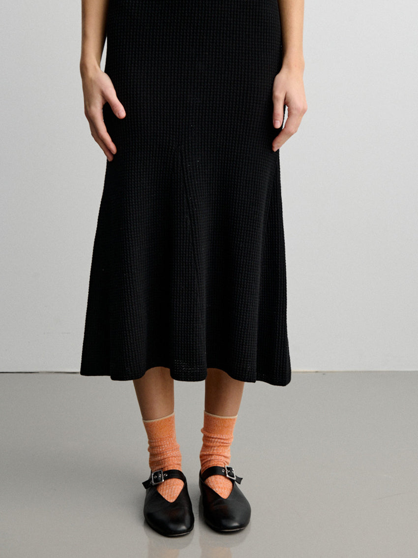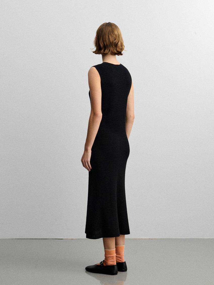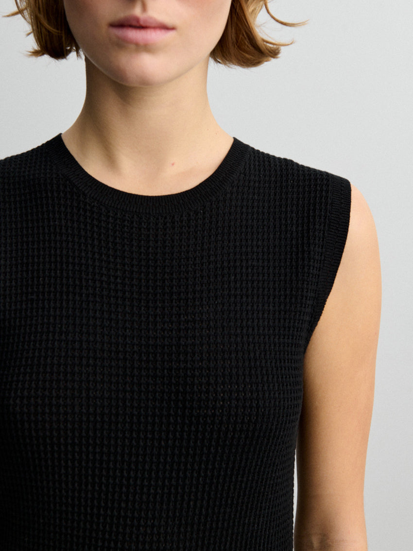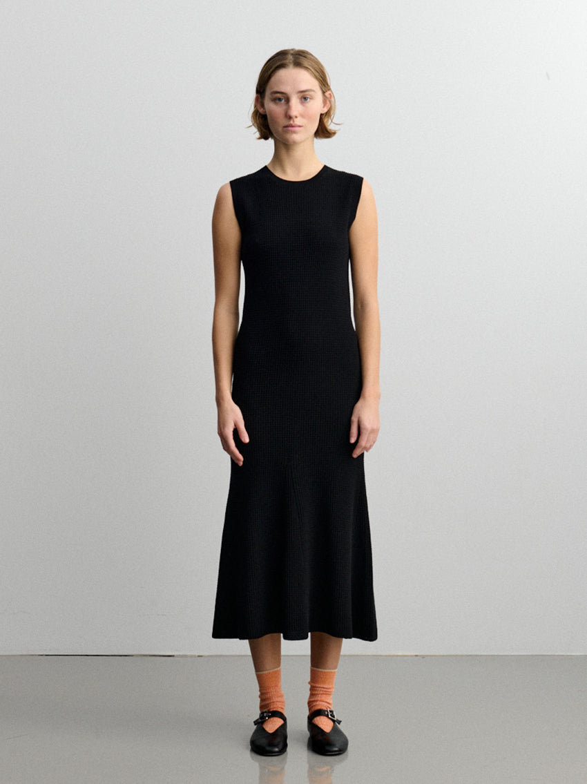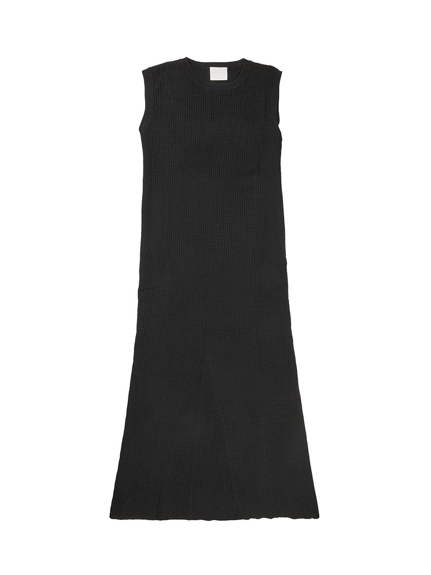 Made from a High Twist organic cotton, this sleeveless Dress in Black by Fub is knitted in a waffle structure with a classic round neckline and rib trim with pointelle detail at the neckline and armholes.