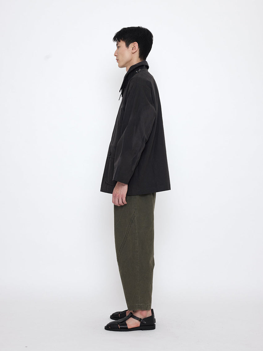 Slanted inseam chest pockets and rounded patch pockets with button closures.