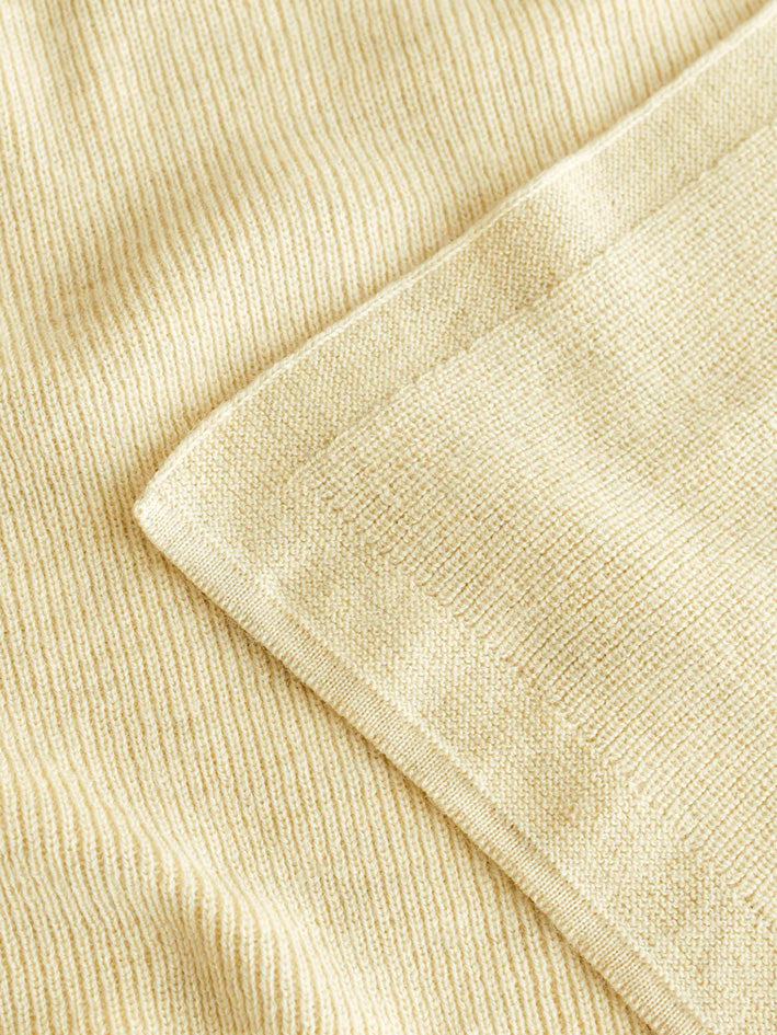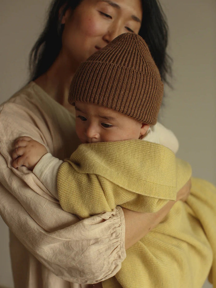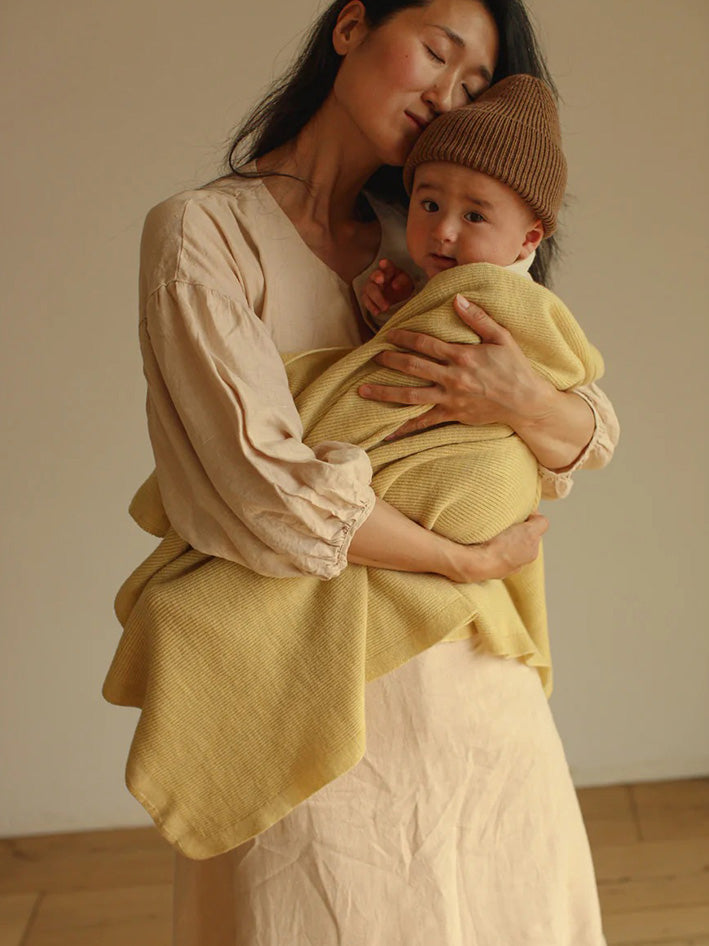 Warm Hvid Felix Blanket in Light Yellow rib knit technique. This is a medium thick blanket, suits for everyone with the big range of colours. Wrap your little one in our soft blankets size: 70x95 cm Material: 100 % extra fine Italian merinowool (oeko-tex,mulesing free). It's not necessary to wash merinowool frequently. This fiber is selfcleaning. It's perfect to just air outside. Otherwise wash it very gently by hand with lukewarm water of MAX.20° Use a wool detergent to wash Machinewash only on a WOOLPROGRAM 20°,low speed, at one's own risk as we cannot guarantee the individual program settings on the washing machines. Merinowool doesn't itch and is antibacterial and therefor perfect for kids with eczema or sensitive skin Made in Belgium