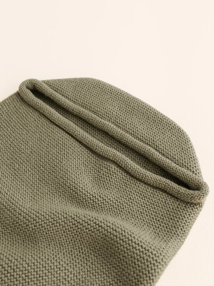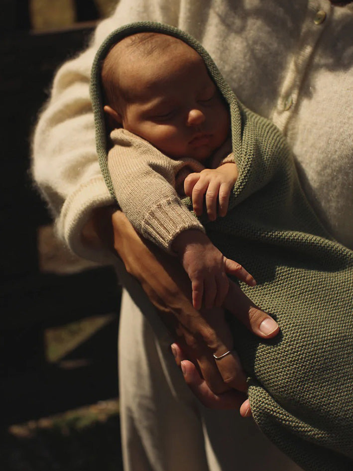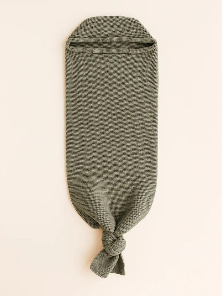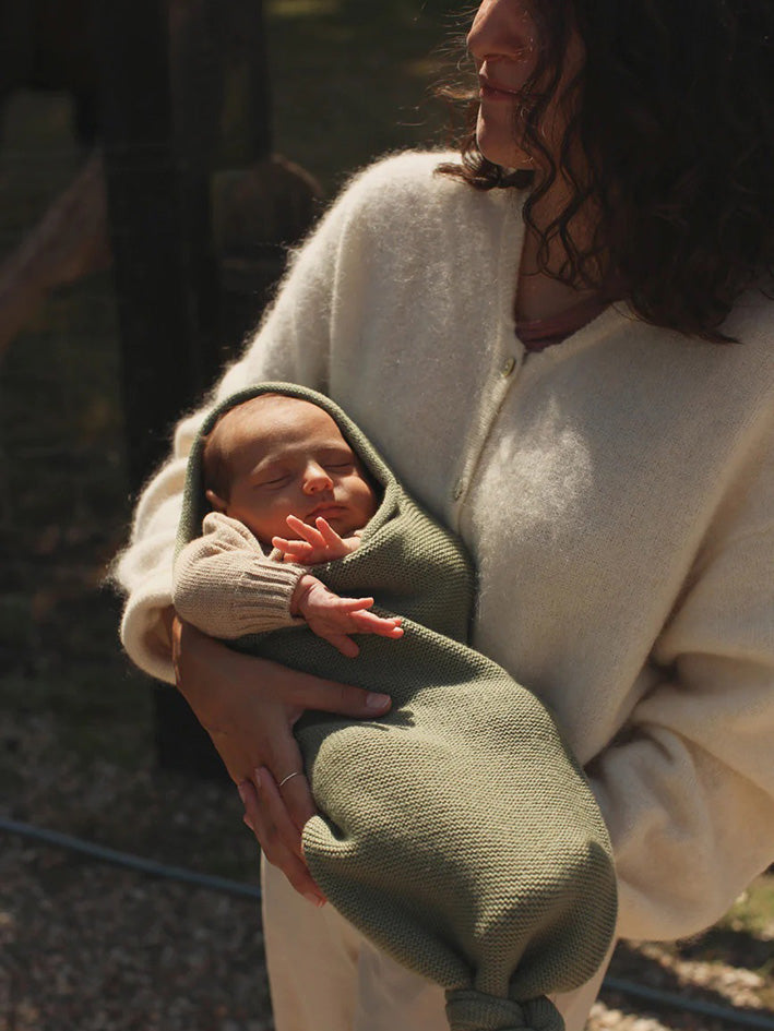 WHY USE THE Hvid COCOON in Artichoke The cocoon imitates a womb. It keeps your baby calm by creating the warm and restricted space like inside the womb. When you use it from birth, they will get used to the feeling of the cocoon and settle in easy. Practice has shown that all babies calm down when they are lying inside the cocoon. Children are enclosed by a womb for a long time. This cocoon gives them the same feeling. It’s a softer form of swaddling your baby. The baby can still move, and is cosied up. Merino wool is thermoregulatying and ensures a good temperature for the baby has. HOW TO USE The cocoon can grow with your baby. Simply place the knot high whith newborns and make it come down when your child grows. Start by putting the button very high on newborns and gradually lower it as you go as your baby grows. Like this your baby cannot slip down. You can place the arms inside the cocoon or leave them out. Put the cap on or off. WHEN TO USE To use during daytime: for supervised naps, in the stroller, to calm your baby down when it has cramps. When your baby cannot settle down in the evening. Just to snuggle up. When you feed your baby. To make a walk. No loosing blankets. After a nice bath. THIS IS NOT A SLEEPING BAG MUST ALWAYS BE USED UNDER SIGHT