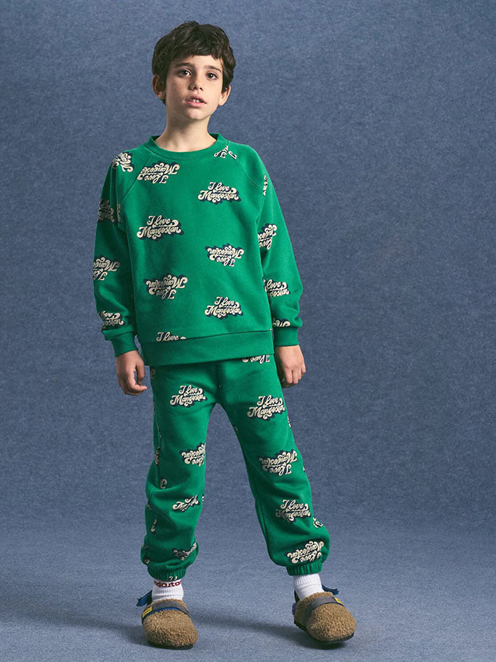 The I Love Mangostan Sweatpants in Green by Maison Mangostan feature a logo all-over print and have an inner elastic waistband for better comfort. Composition: 100% Organic Cotton This item is normally sized, we suggest you select your regular size.