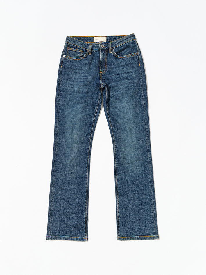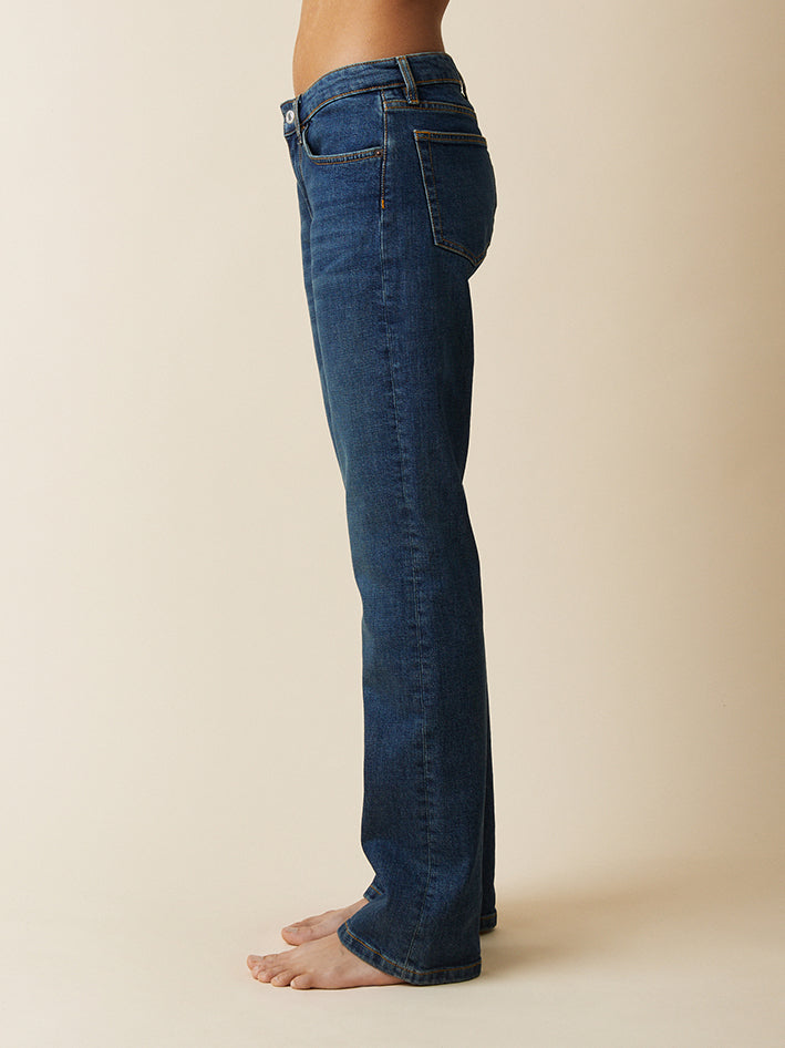 ’Idaho’ is a contemporary take on the 90’ies low waist straight fit Jeans by Jeanerica. Featuring a low waist, zip fly and a straight fit from thigh to bottom leg which creates a slight bootcut silhouette. Made in Vintage-washed and gently faded Dark blue organic denim, combining the robust texture of classic Jeans with a hint of stretch. Finished with classic tobacco stitching. 98% organic cotton, 2% elastane Low waist Bootcut Zip fly Classic tobacco stitching