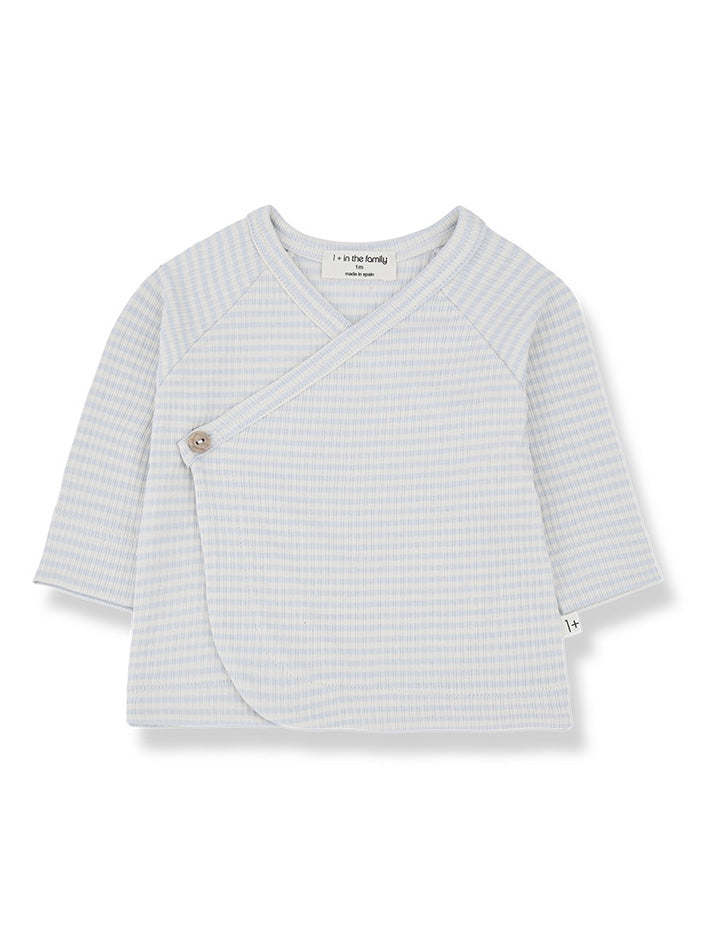 This beautiful Idara wrap Top by 1 + In The Family made of subtle ribbed fabric is made in a light color with an all-over peach stripe, a narrow horizontal stripe in Misty Blue color . The wrap top with long sleeves has a wooden button detail and a bow on the inside, so that the wrap stays in place. A beautiful wrap cardigan for a newborn baby. Material composition: 48% cotton 48% modal 4% elastane |