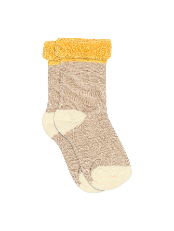 Classic Indy Baby Socks in Beige Melange with contrasting colors from MPkids. Knitted in cotton with a soft cotton terry quality on the inside. The socks have a heel, toe and folded edge in contrasting colors. To ensure the best possible fit, the socks have an anatomically correct heel with a 90° angle and a folded edge at the ankle. The socks have a reinforced heel and toe. * Soft inside due to cotton terry * Reinforced heel and toe * Anatomically correct heel for optimal fit * Designed in Denmark - Made in Latvia * OEKO-TEX® STANDARD 100 CERTIFIED