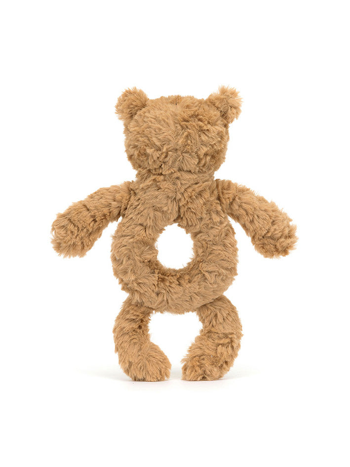 A timeless character for curious newborns, easy to grab by any one of his four paws or round tummy and gently jangle. This loveable Bartholomew Bear Ring Rattle from Jellycat has a rich, soft textured biscuit coat, made with recycled fibres and features his signature chocolate nose and rounded ears. Dimensions: 18cm x 8cm x 2cm Sitting Height: 12cm Main Materials: Recycled Polyester Inner Filling: Recycled Fibres Embroidered Eye