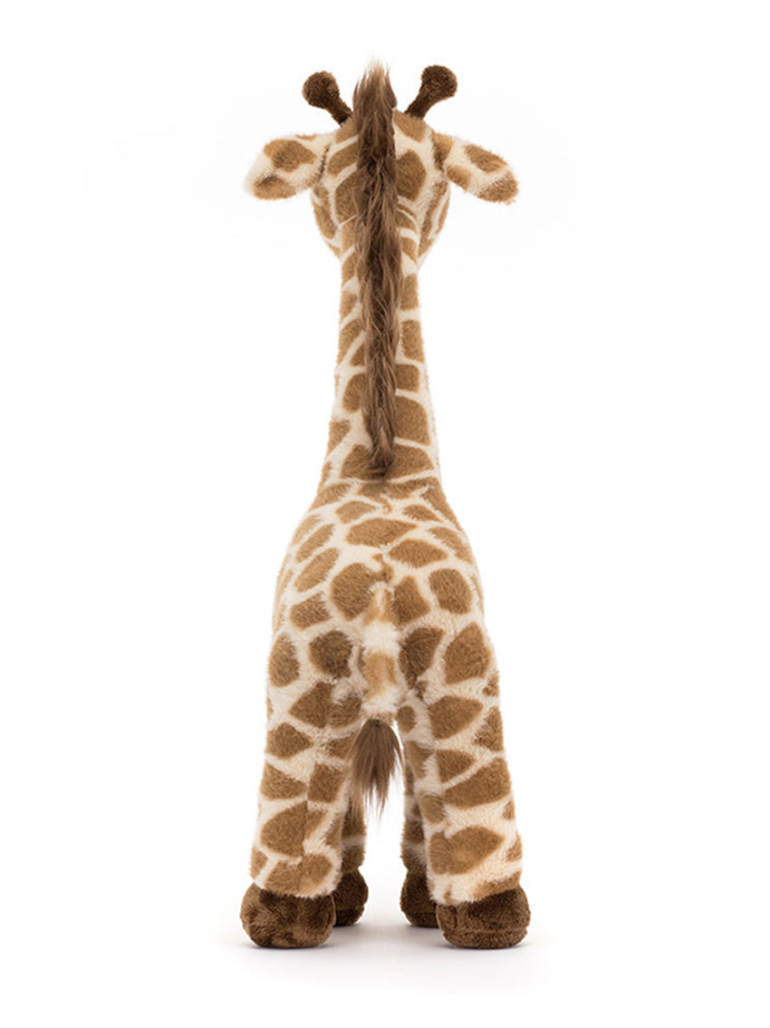 A lofty mascot for any nursery, Dara Giraffe by Jellycat stands tall and proud! Scrumptiously soft in mottled banoffee fur, with cocoa horns, weighted hooves, a silky mane, and tufty tail. With such a welcoming smile, Dara makes playtime a fun safari! Dimensions: 56cm x 14cm x 19cm Sitting Height: 56cm Main Materials: Polyester, Acrylic Inner Filling: Polyester Fibres, PE Beans Hard Eye