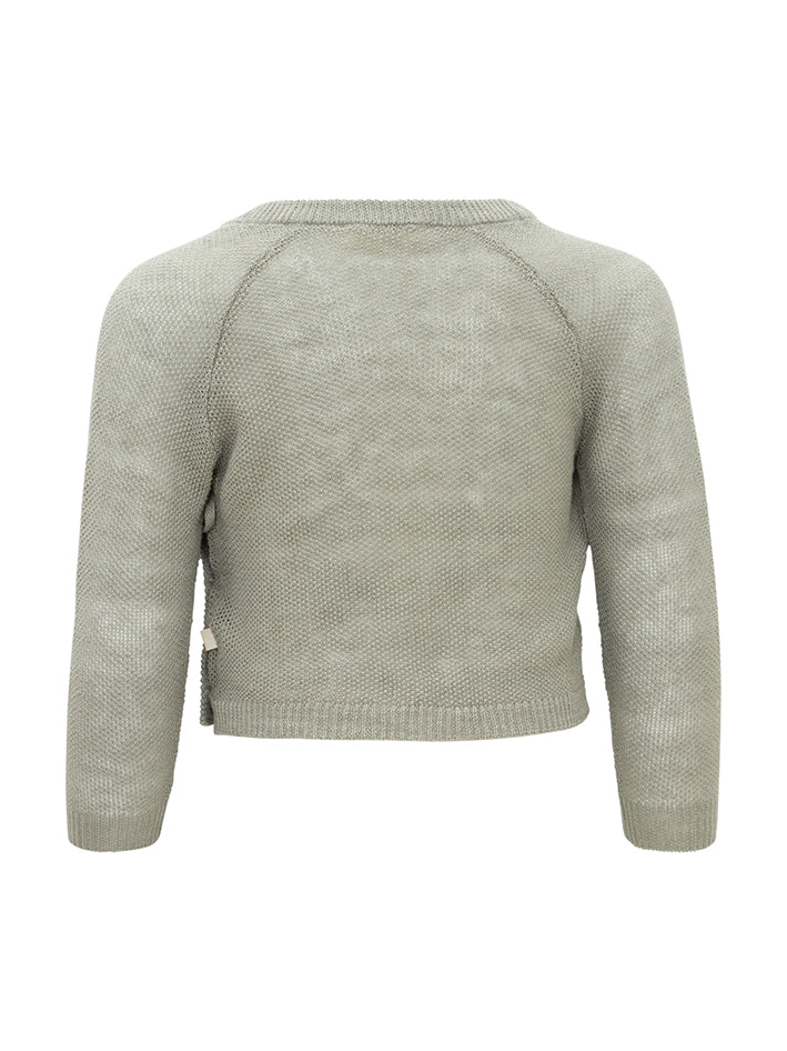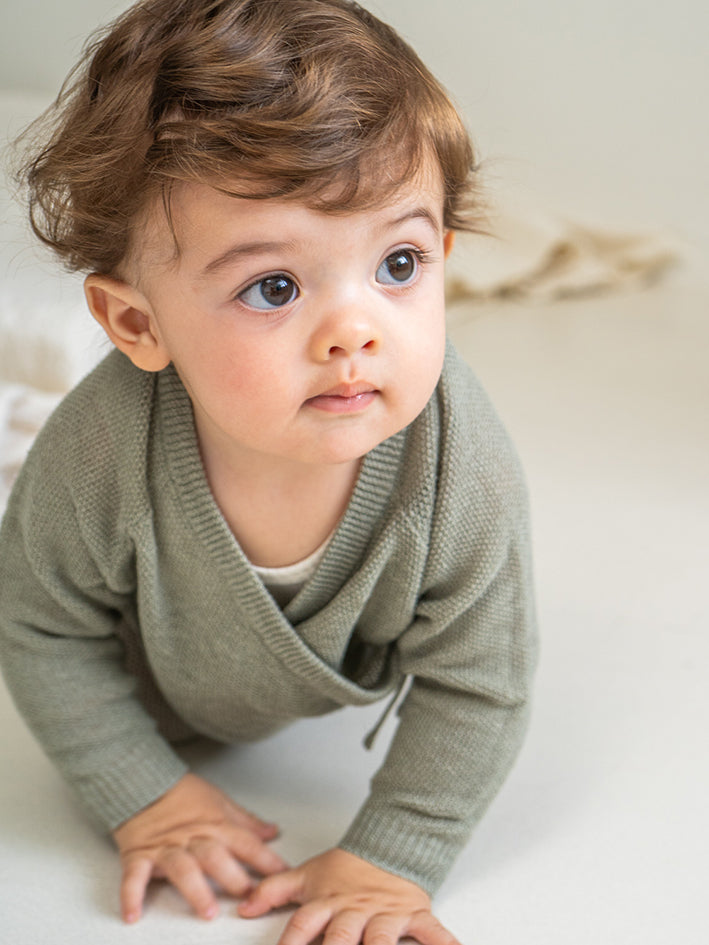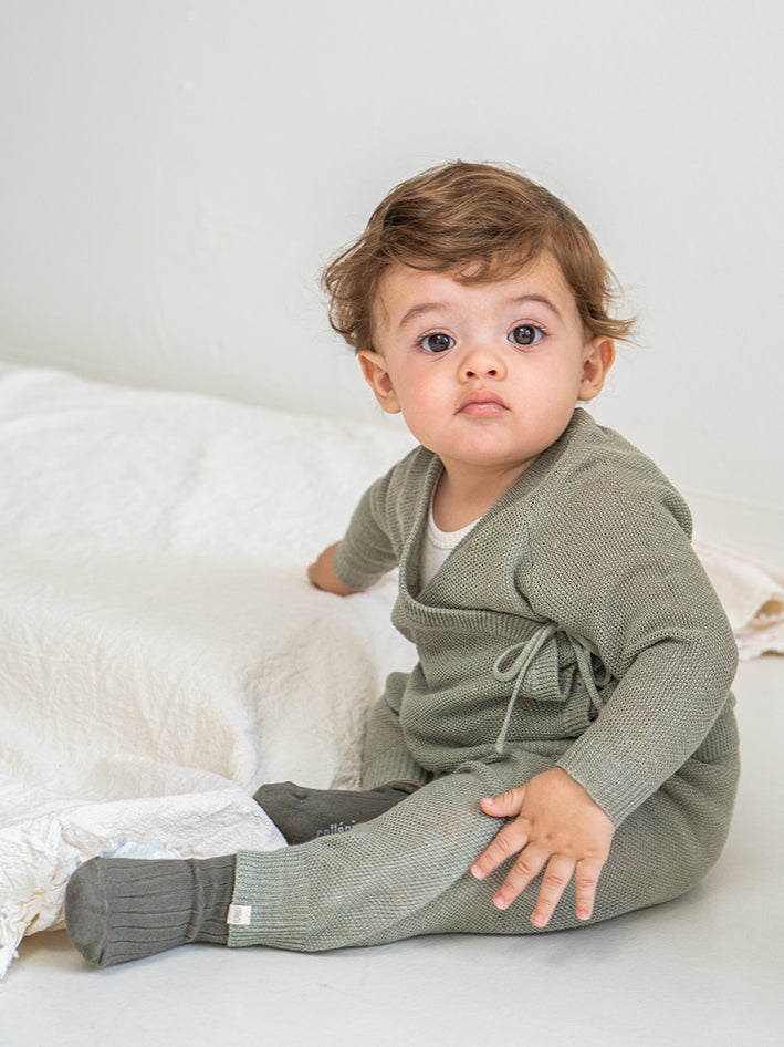 Wrap your little one in the cozy charm of our adorable linen knit Jewel Wrap-Cardigan in Shadow from Minimalisma , perfect for both baby boys and girls. Crafted from 100% linen with a beautiful moss knit pattern, this wrap-cardigan features a stylish cross-over front that ties at the side for a snug fit. Two beautiful shell buttons add a touch of elegance and ensure an improved fit, making this cardigan both practical and irresistibly cute. Quality: 100% Linen
