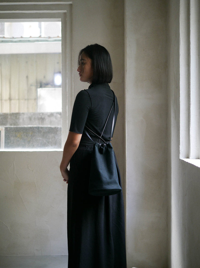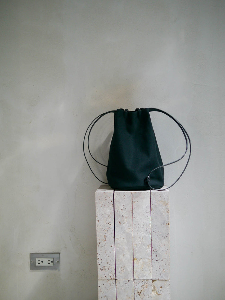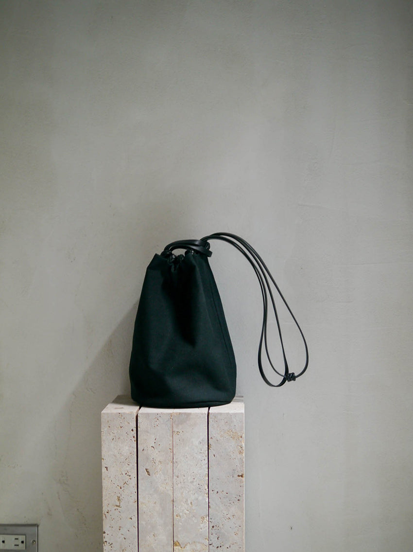 The Drawstring Bucket is sized for a long wallet, water bottle and daily needs.