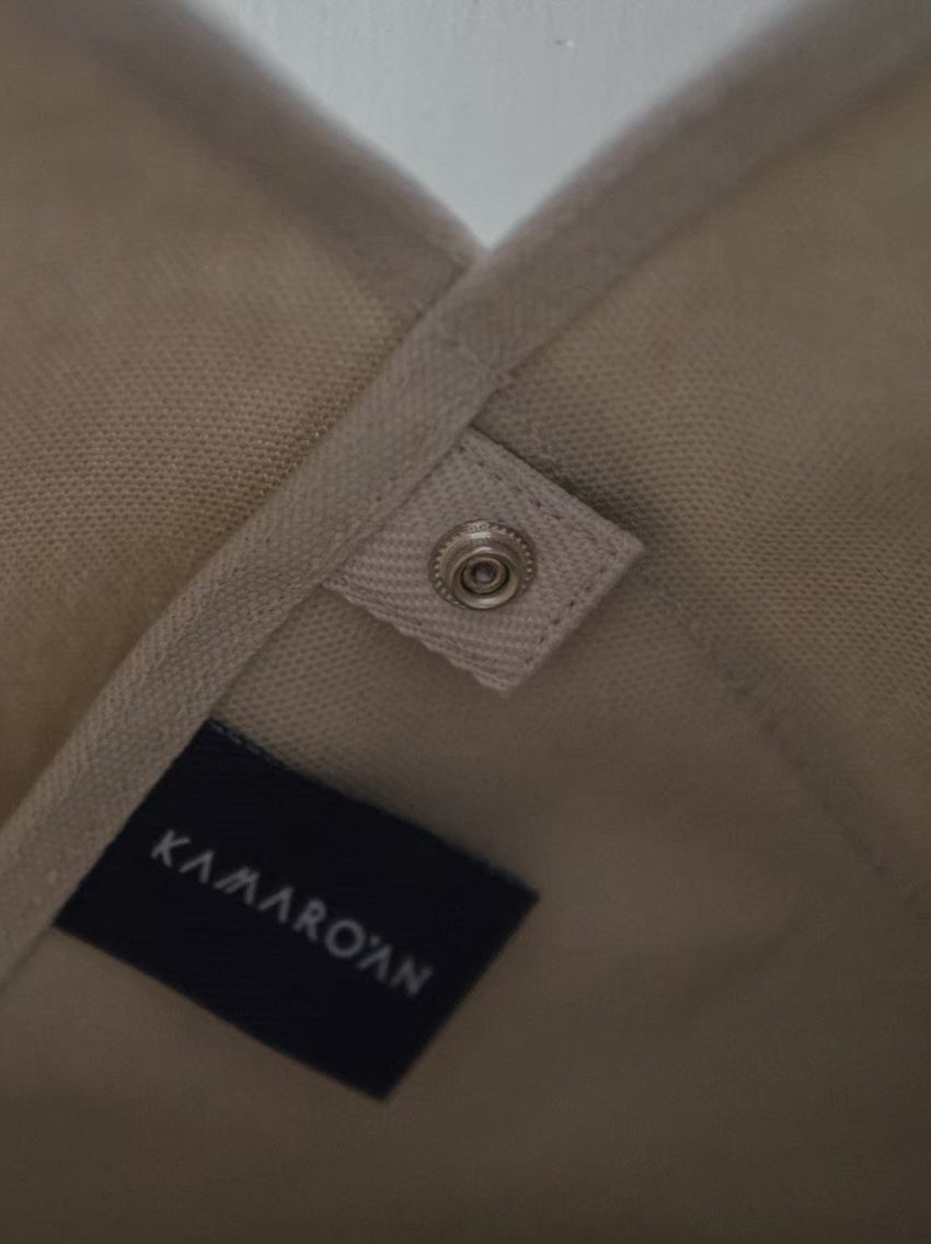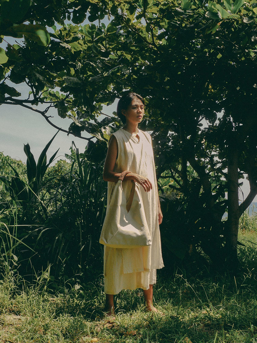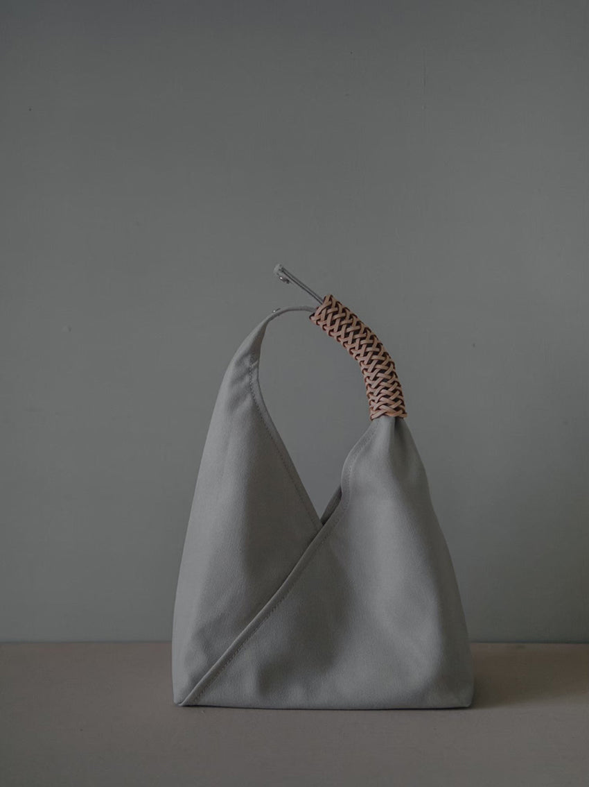 Woven Triangle Bag 58 in Ivory from Kamaro'an. The one-thread Woven handle, rooted in traditional Pangcah weaving techniques, pairs with the Azuma bag, inspired by rice-carrying bags from Taiwan’s eastern coast during the Japanese colonial period. *The leather handle is detachable for easy cleaning. *Fits a 13-inch laptop and daily essentials, light weighted with large capacity. *Hidden pockets for organized storage. Made from durable, water-repellent canvas produced in Taiwan, with an inner coating to maintain its shape. A blend of tradition and practicality.