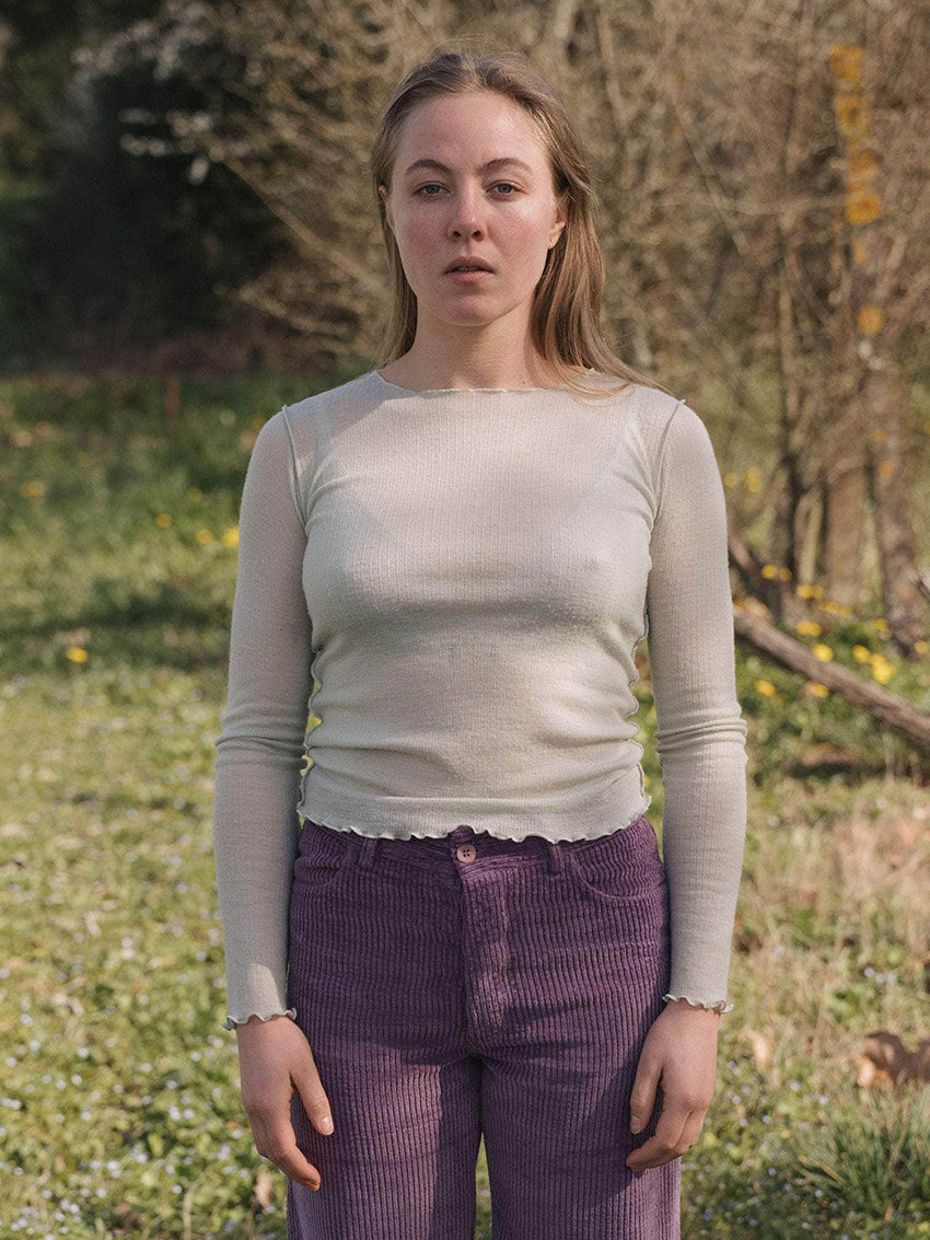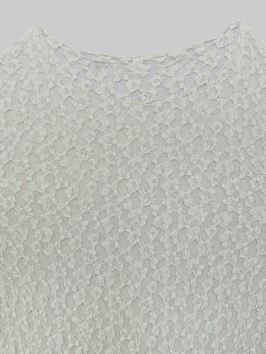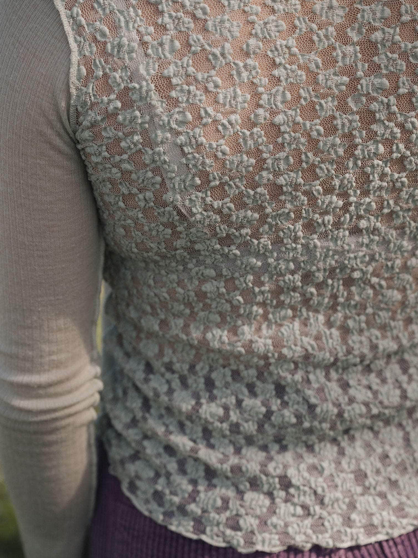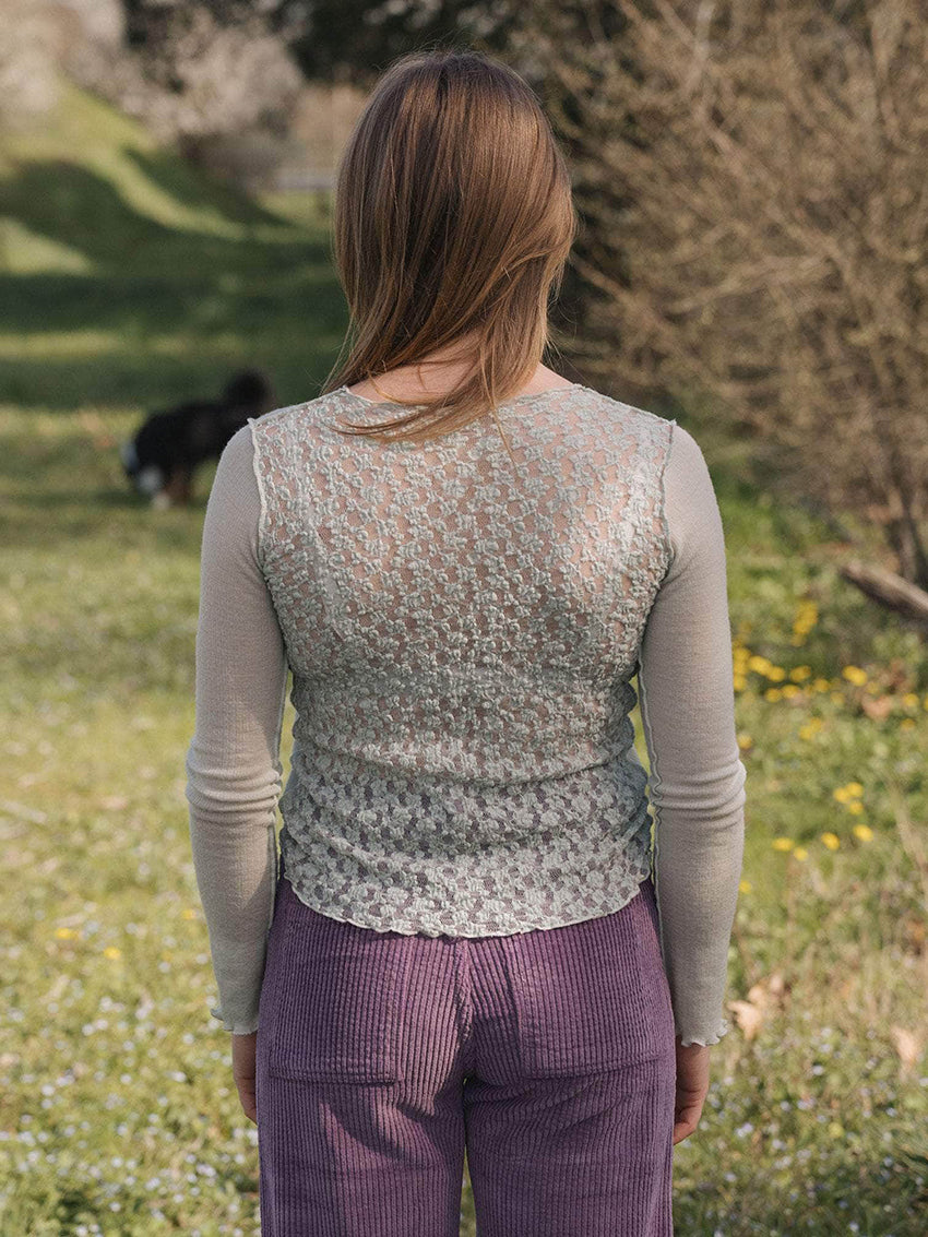 Fine wool rib long sleeve with boat neck, exposed seams and lace detail at back.