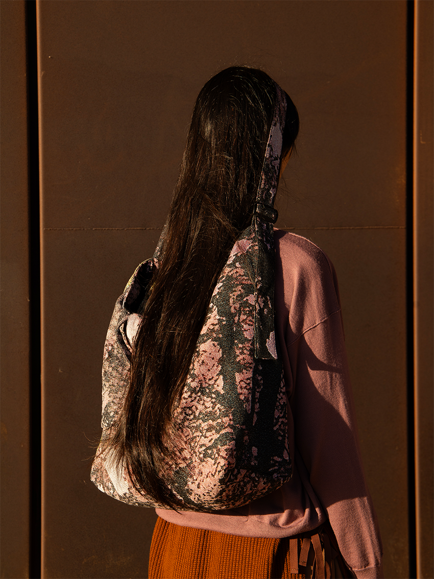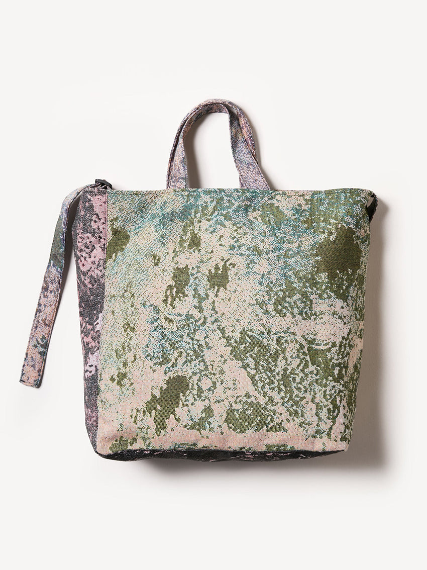 A purpose-built tote bag crafted in the unique Kloke-designed woven jacquard fabric depicting real tree camouflage.