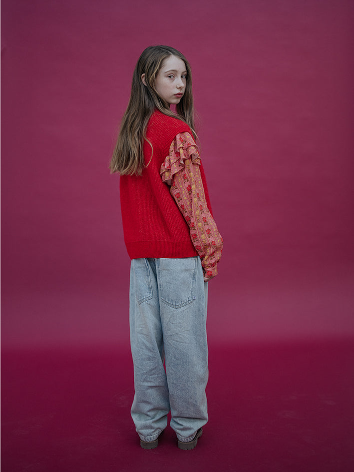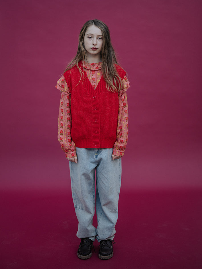 This sleeveless Repose Ams Knit Vest Red with V-neck brings sophisticated layering to any wardrobe. The classic vest silhouette offers versatile styling options, perfect for creating polished looks year-round.