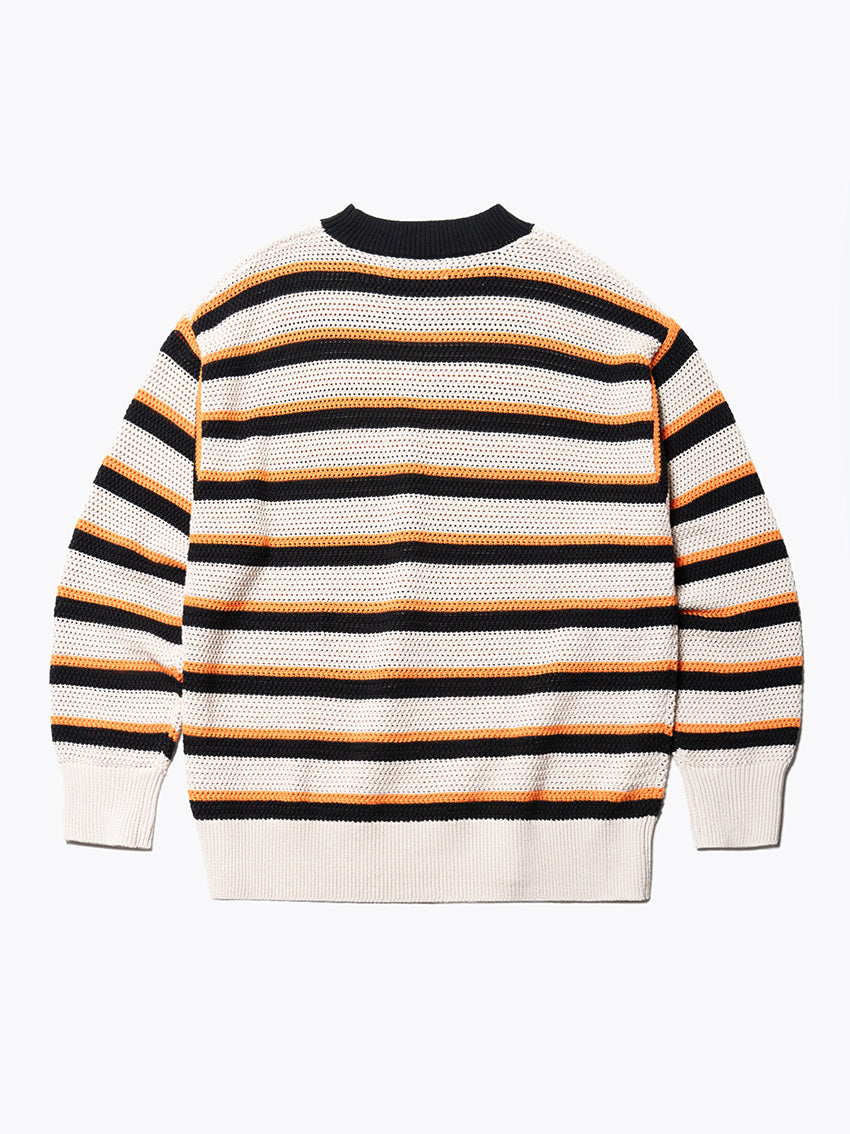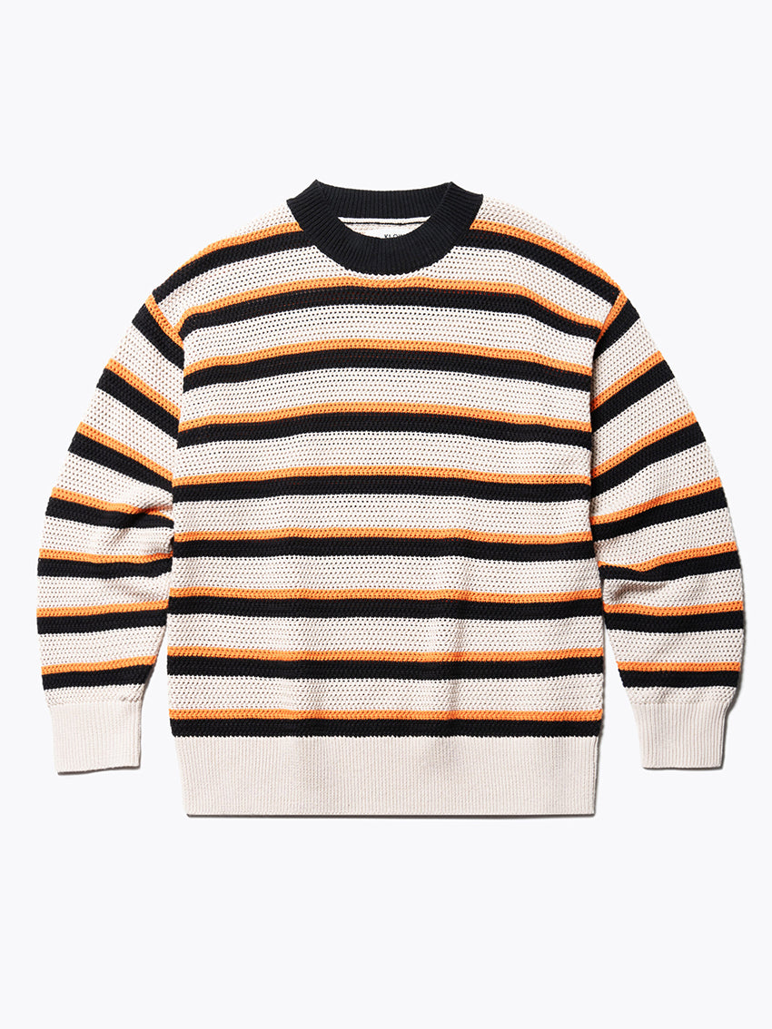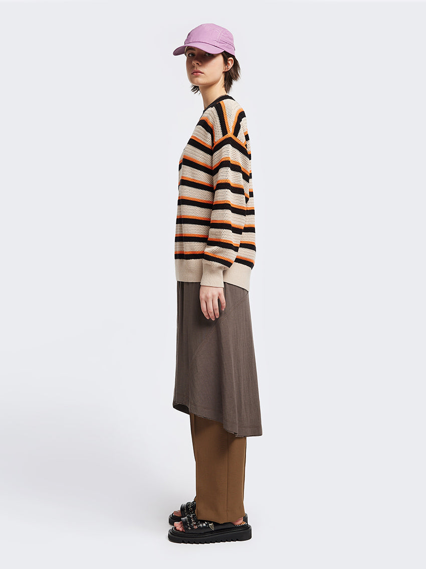 The Lakeside Crochet Sweater Stripe by Kloke is a fully fashioned soft cotton knit with an open crochet structure. Bold stripes accent the crew neck silhouette, evoking a sense of nostalgia. Style it with your favourite Kloke jeans or layer it over a dress for breezy summer nights. A versatile piece that effortlessly adds a pop of colour to your summer wardrobe. 100% Cotton