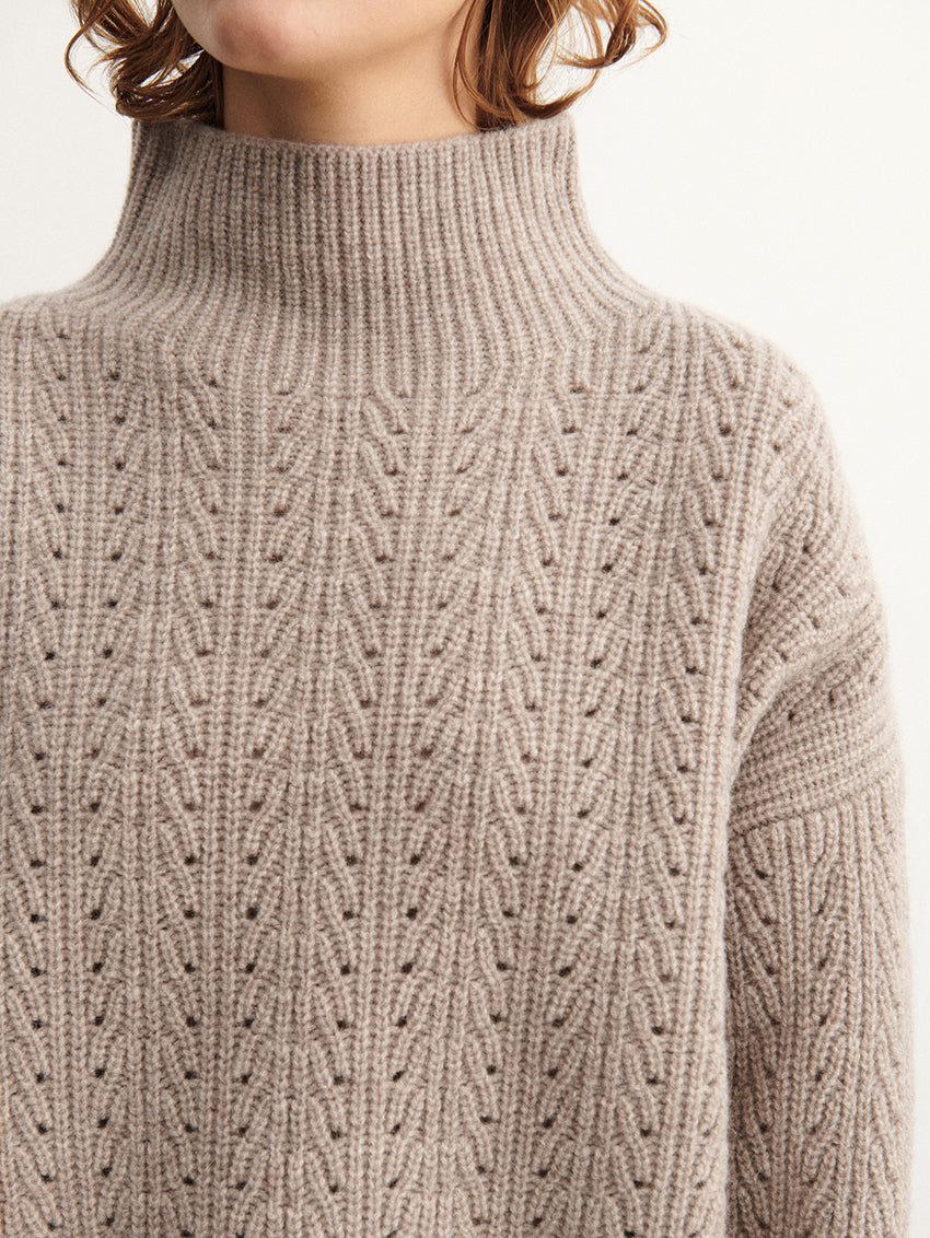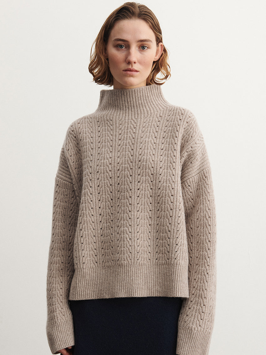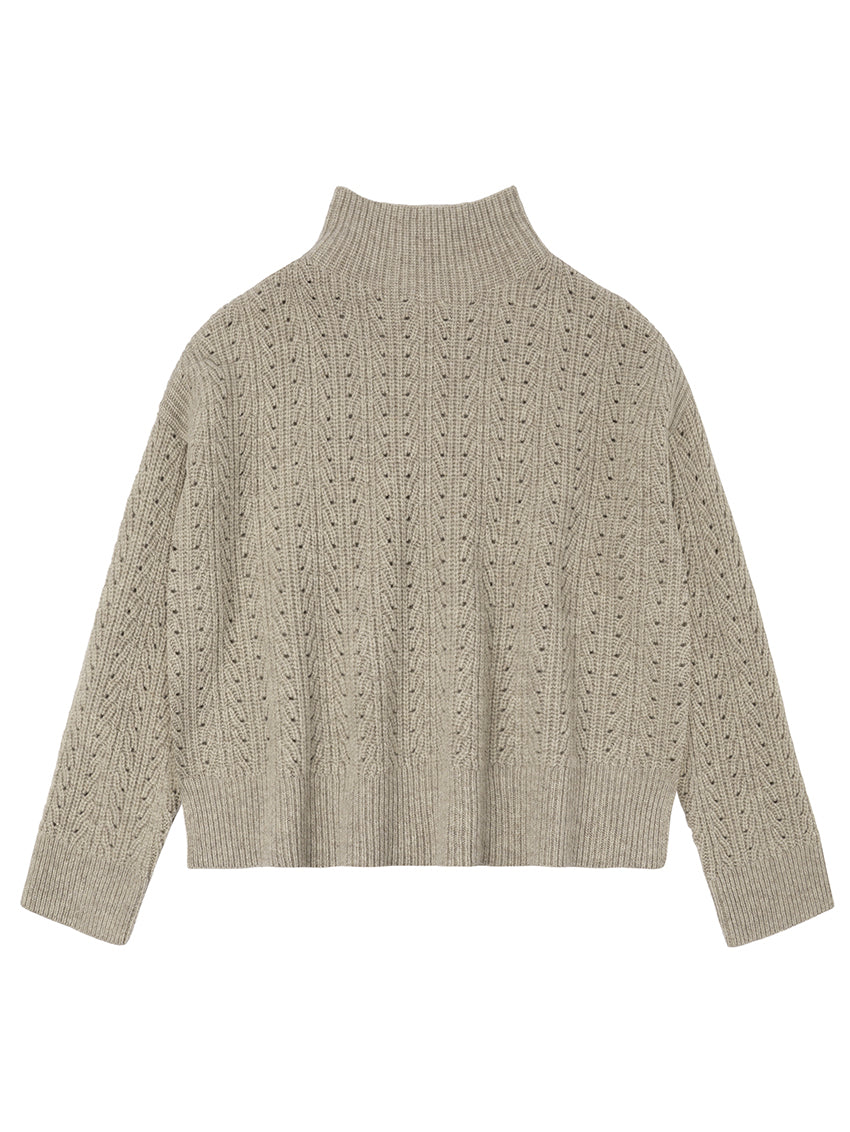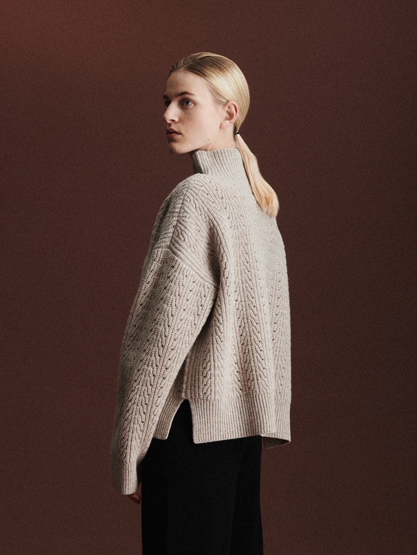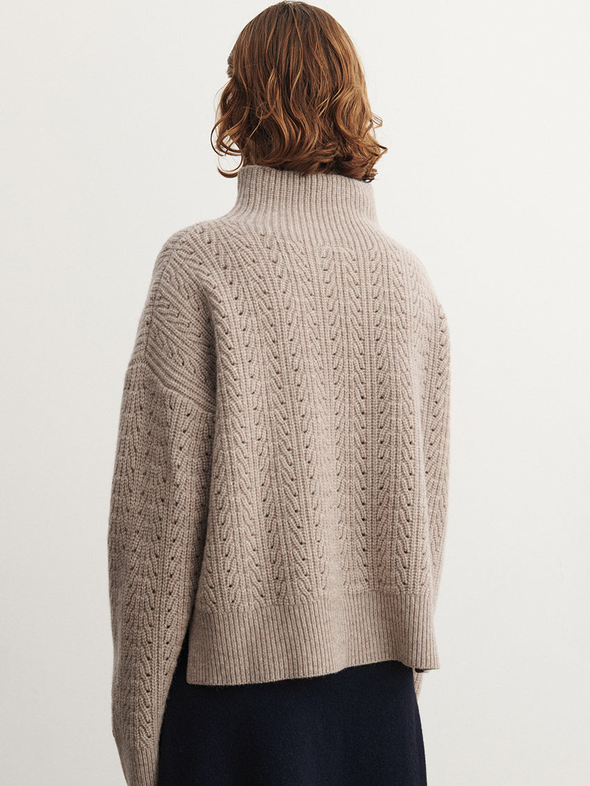 This sweater is knitted in a decorative structure and has a loose fit. It features a high neckline, ribbed hems, and dropped shoulders.