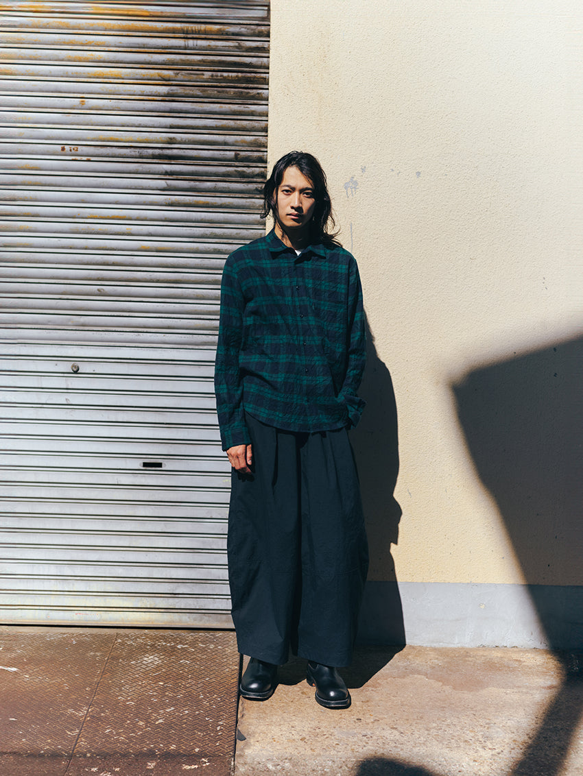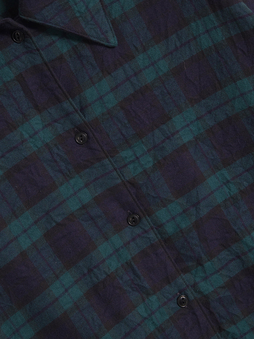 Features a check pattern, exaggerated pointed collar, relaxed fit with dropped shoulders and a centre pleat on back.