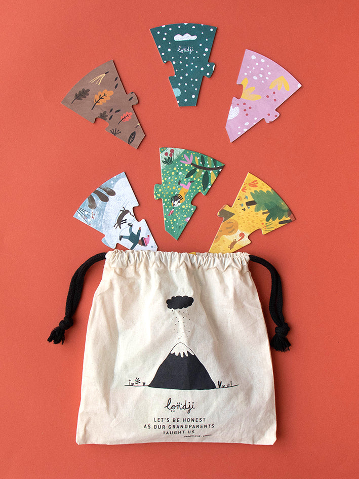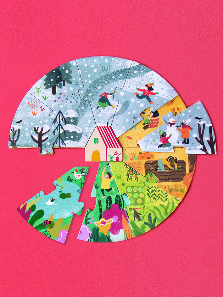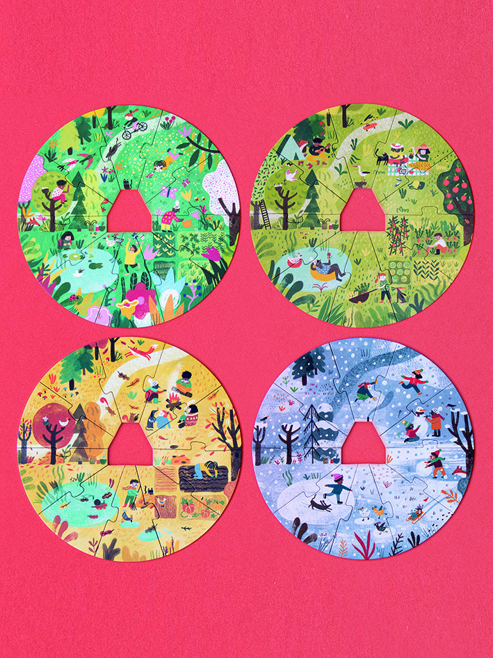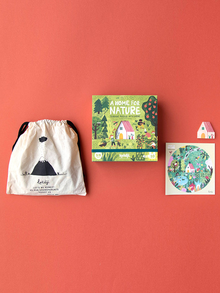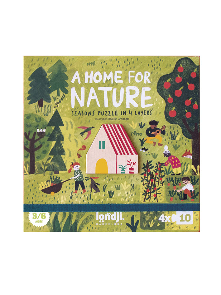 A Home For Nature by Londji are 4 Puzzles with 10 pieces each are assembled one on top of the other as we discover how nature changes in each season, with a little wooden cabin at the centre of the game.