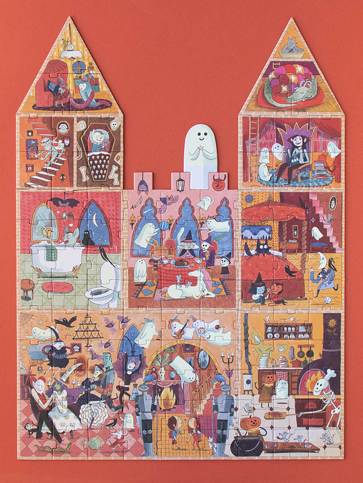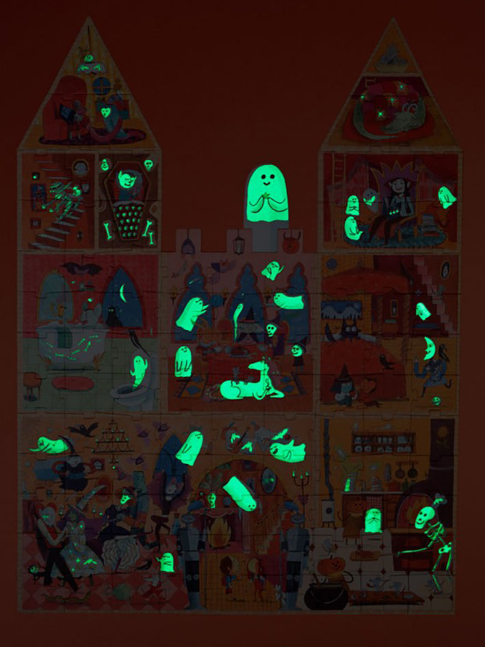 Boo! Who dares to enter the haunted castle? Assemble the puzzle, turn off the lights and... surprise! Surprise! Ghosts glow in the dark!
