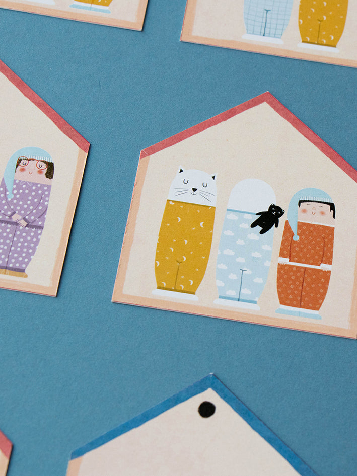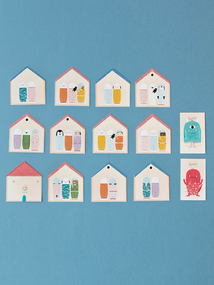 Using the house-shaped cards, the goal for each player is to find all the members of a family in one