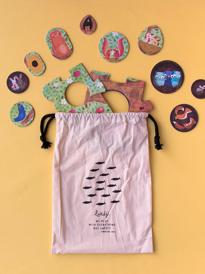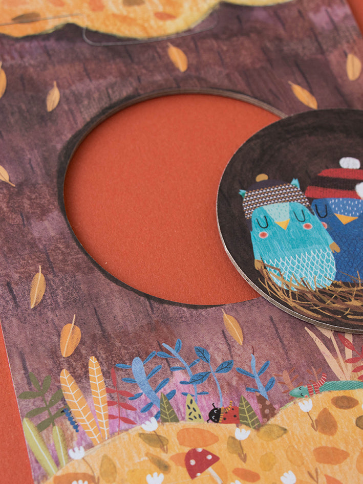 In spring, our apple tree welcomes a family of squirrels, a nest full of small birds, playful owls and a mischievous cat. Underground mice, rabbits and moles hide inside their burrows. In autumn we have already harvested the sweet apples, discover what our friends are doing until the good weather returns!