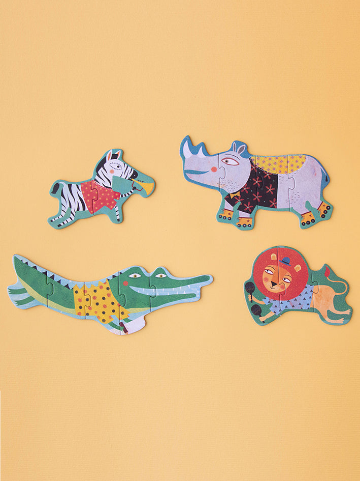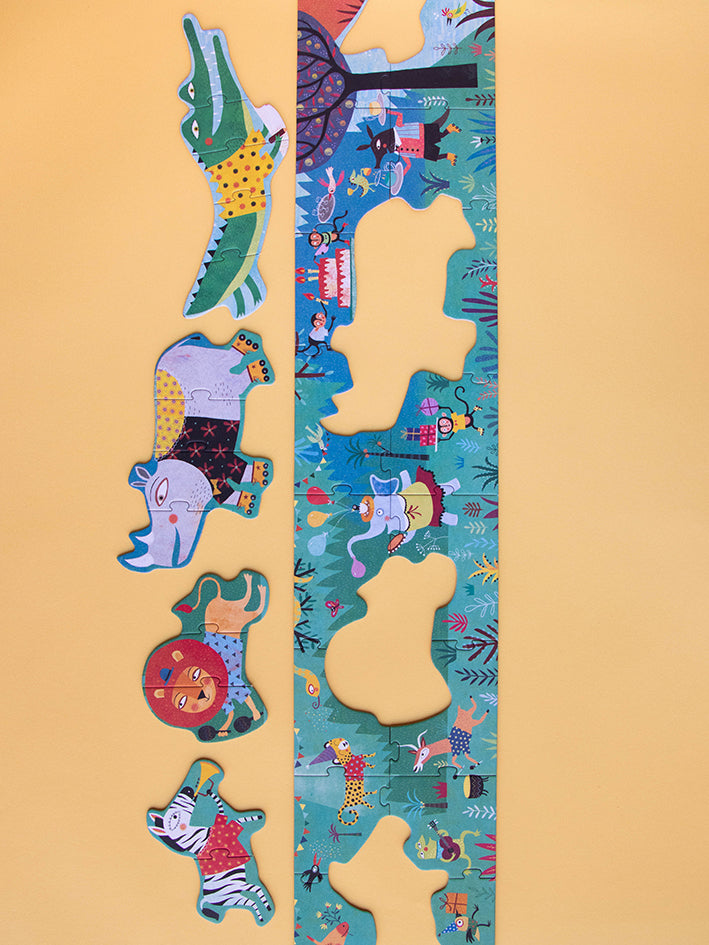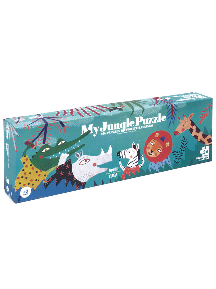 A progressive Jungle Puzzle with sets of 2, 3, 4 and 5 pieces. They fit into a 20-piece set. A big puzzle made for small hands.