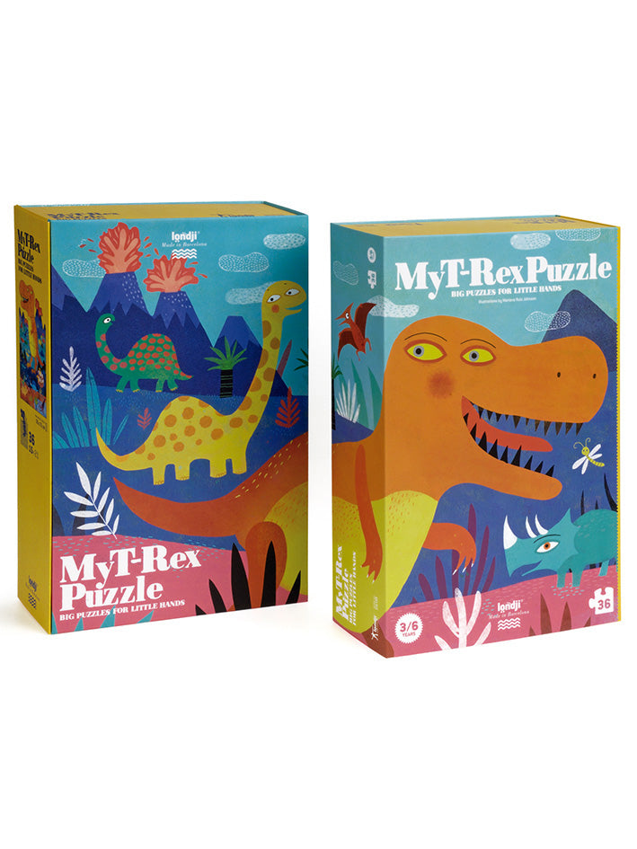 Welcome to the Jurassic of Londji, our T-Rex Puzzle will open the doors to a fantastic world where triceratops, diplodocus and pterodactyls will take you for a ride. Roarrrrrr! The puzzle allows us to assemble the dinosaur separately from the landscape, forming part of a collection in which the protagonists are very large reptiles.