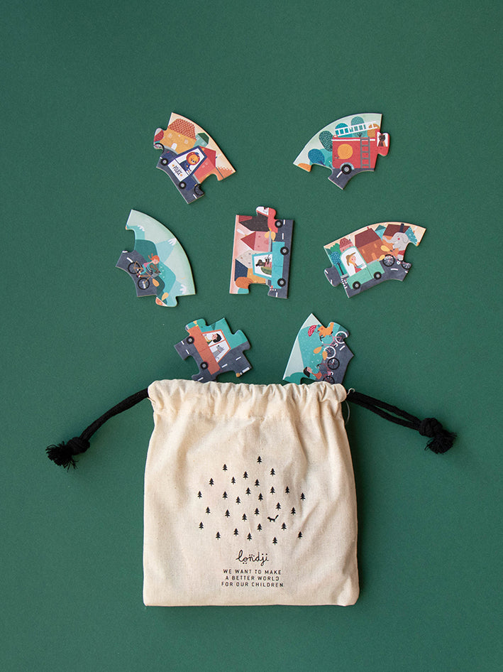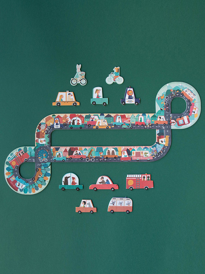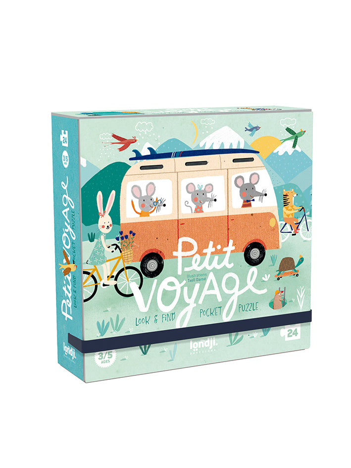 Cautious drivers, happy cyclists and lorries full of ice cream..... The never ending road! Once the Petit Voyage Puzzle by Londji s set up, there is a small game to play. Which player will be the first to find all 10 drivers?