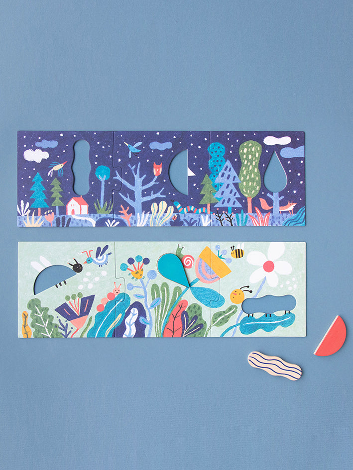 Assemble the puzzles and insert the wooden pieces.4 puzzles of 3 large pieces each with 3 wooden pieces that change their meaning depending on the illustration they fit into. From 2 years old.