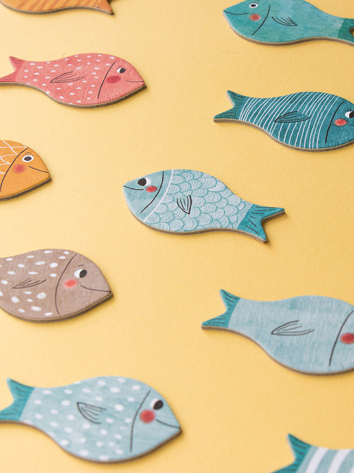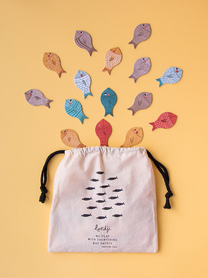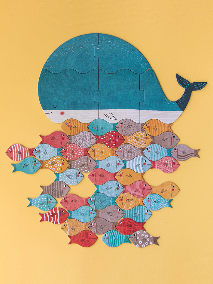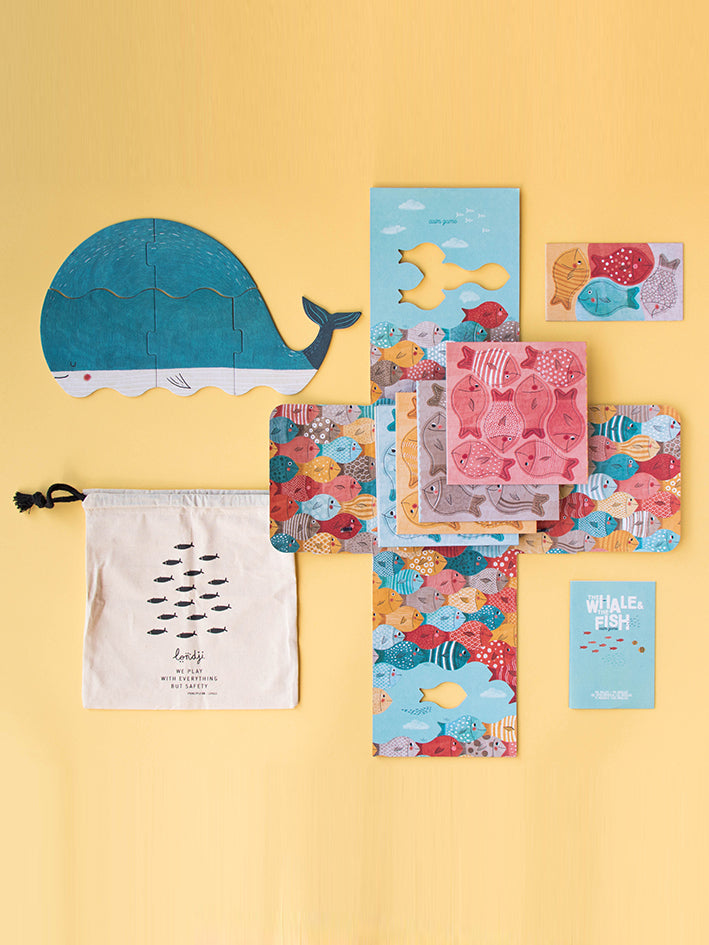 Londji Whale & the Fish Game, without rules or instructions, stimulates a child's development through playfulness and spontaneity.