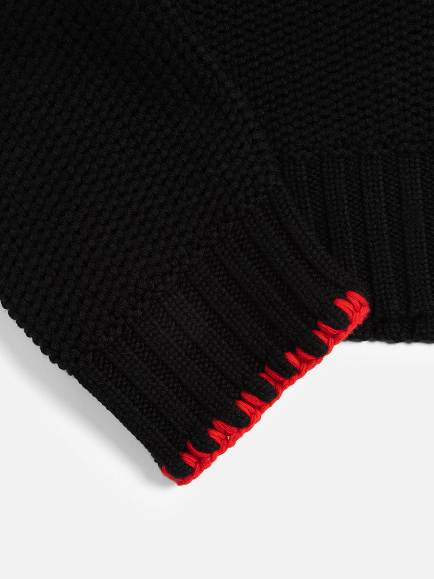 Knitted crew neck cardigan with honeycomb knit texture and hand finished blanket stitch.