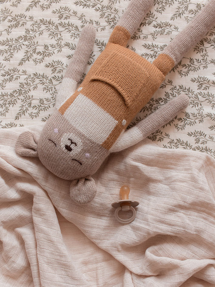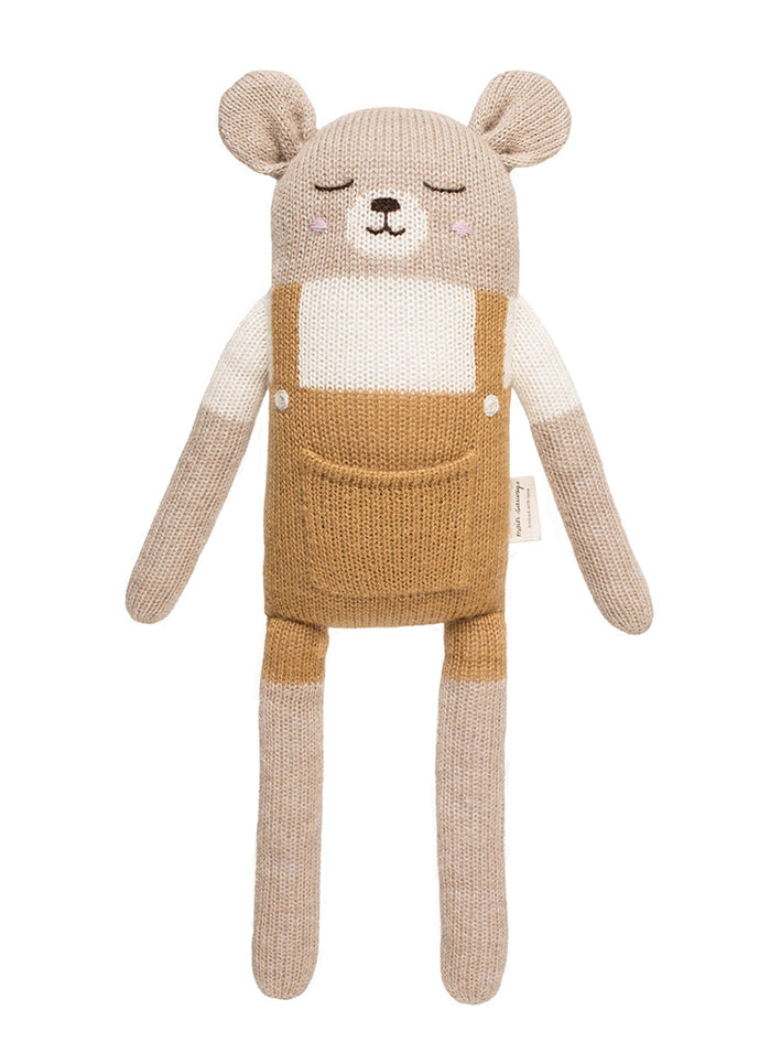 With his XL size, Mrs. bear, the Main Sauvage Big Teddy Soft Toy with Mustard Overall is the perfect friend for hours of cuddles! – Hand knitted in 100% Baby Alpaca wool – Hypoallergenic and antibacterial material – Eco-friendly, non-toxic dyes Size: approximately 42 cm (17″) Colours: ochre, beige, off-white