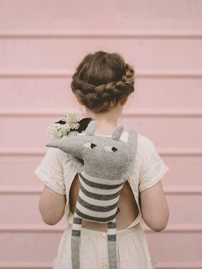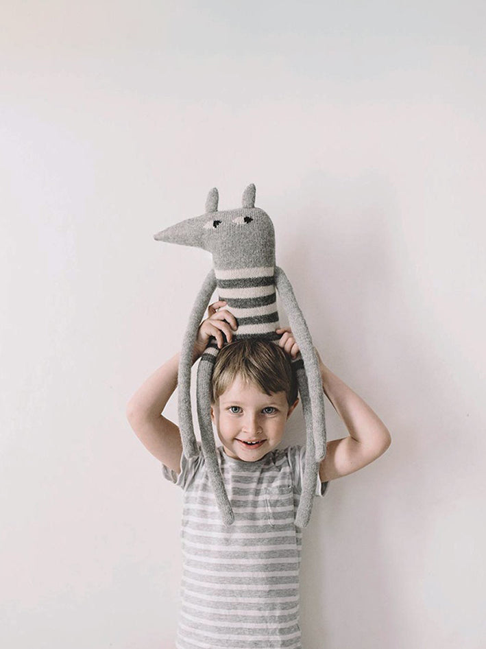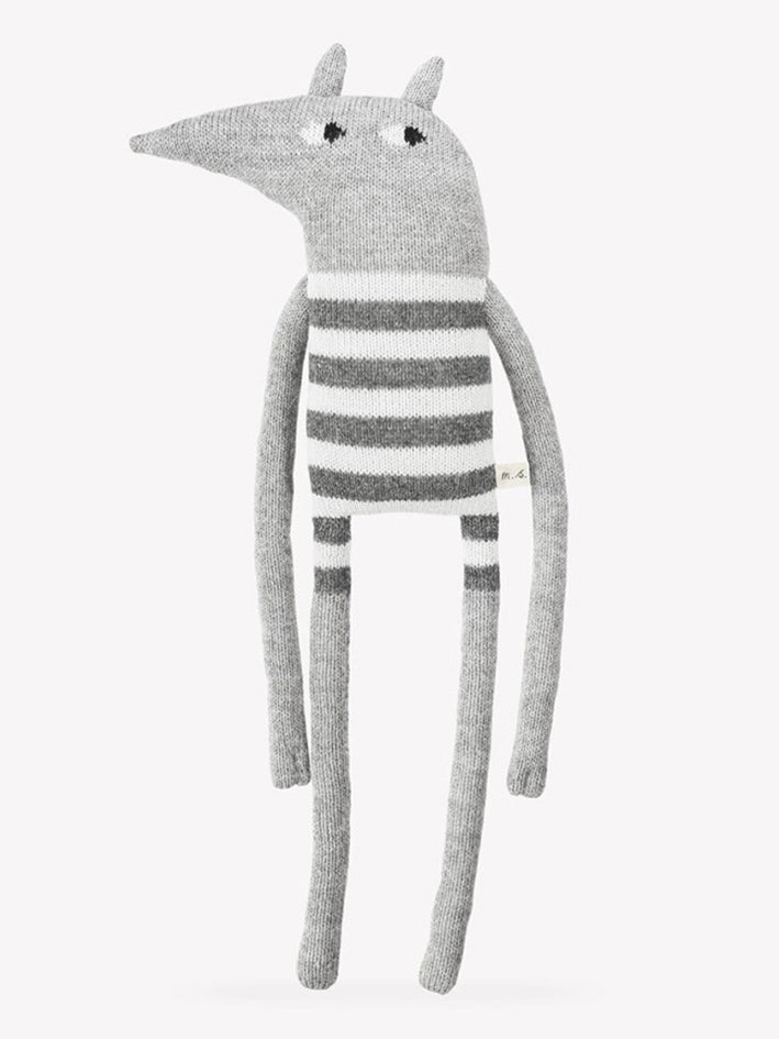 The Main Sauvage Big Wolf Striped is Handknitted in a fair-trade workshop in Bolivia, this toy's making supports an intelligent production, respectful of Earth and humans’ rights. Like all our knitted toys, this teddy bear is made in pure baby alpaca wool, which is antibacterial and perfectly adapted for sensitive skins. Size: approximately 55 cm (22″) Hand knitted in 100% Baby Alpaca wool Hypoallergenic and antibacterial material Complies with European safety standards Suitable from birth