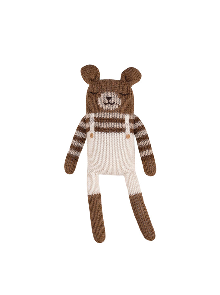 With his adorable Ecru Overalls and striped sweater, the Main Sauvage knitted Teddy bear will melt the whole family. His size is perfect for baby’s tiny hands. He makes a nice birth gift! Eco-friendly fact: the wool colors used for this toy are natural shades of alpaca. No dye was used! Handknitted in a fair-trade workshop in Bolivia, this toy's making supports an intelligent production, respectful of Earth and humans’ rights. Like all our knitted toys, this polar bear is made in pure baby alpaca wool, which is antibacterial and perfectly adapted for sensitive skins. Size: approximately 23 cm (9″) Hand knitted in 100% Baby Alpaca wool Hypoallergenic and antibacterial material Complies with European safety standards Suitable from birth