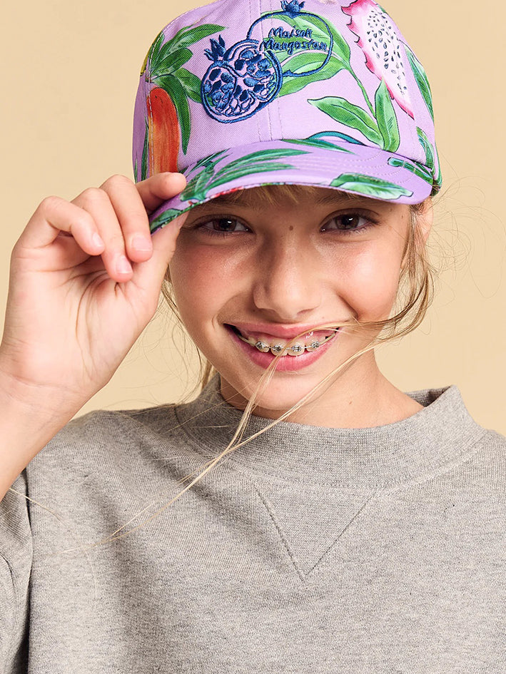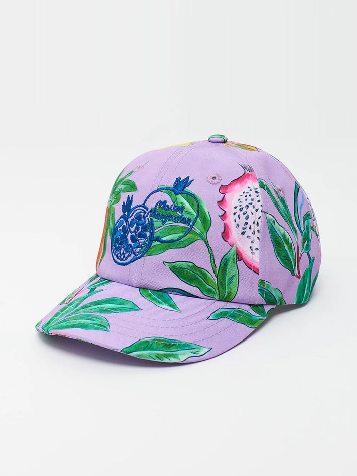 The Pommegranate Cap in Lilac by Maison Mangostan is a comfortable accessory featuring a passion fruit all-over print and pommegranate embroidery. It has an adjustable back strap. Made in China. Composition: 100% Polyester