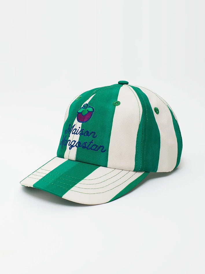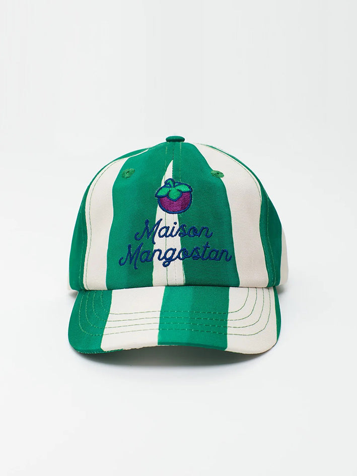 The Maison Mangostan Logo Cap in Green and White is a comfortable accessory with a Striped all-over print featuring an embroidered Maison Mangostan logo. It has an adjustable back strap. Made in China. Composition: 100% Polyester