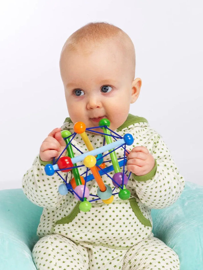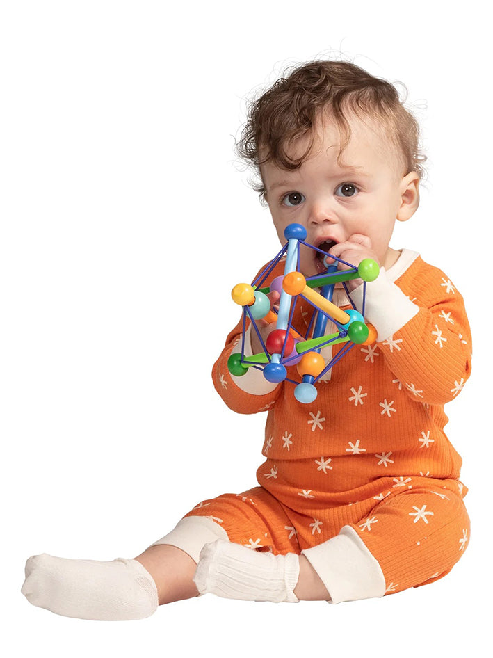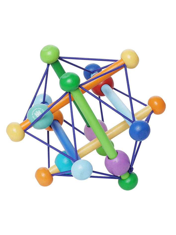 The award-winning Skwish Color Burst from Manhattan Toys is a one of a kind wood rattle and teether toy with pastel colors. Made from renewable rubberwood and strung together with durable elastic cords. It Skwishes and returns to its original shape, with beads that slide and rattle. The unique design offers tactile, sensory play while doubling as a teether and rattle toy. Skwish Color Burst has easy to grasp design encourages fine and gross motor skill development while providing cognitive and visual stimulation.