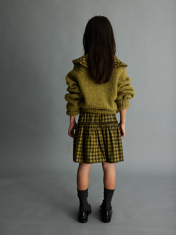 Discover the charm in the Martina Gingham Skirt in Green from My Little Cozmo. It's playful fashion blended with timeless style for every day. Perfect for their lively moments, it gives comfort while keeping them on-trend. Whether it's for school spirit or weekend fun, this skirt's versatility shines. Add whimsical delight to their wardrobe—choose the skirt that stands out for its ease and cheer. Tiered. Elasticized waist. Ruffle detail. Brushed on the outside for a buttery feel. 100% COTTON WOVEN