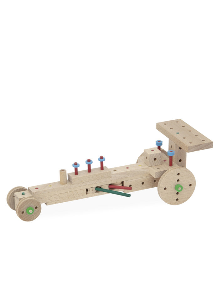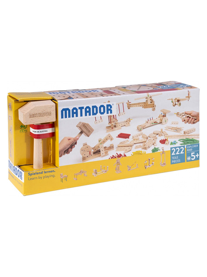 The Matador Explorer E222 is from 5 years - stable and durable - 100% Austrian wood, 100% Made in Austria - Building functional models - Build with hammer and pliers - Contents: all parts of the E099 + 123 parts = 222 parts - Included tools: hammer, pliers - Template booklet: Building instructions with 55 building ideas - Size: 383 x 95 x 170 mm - Weight: 0.70 kg